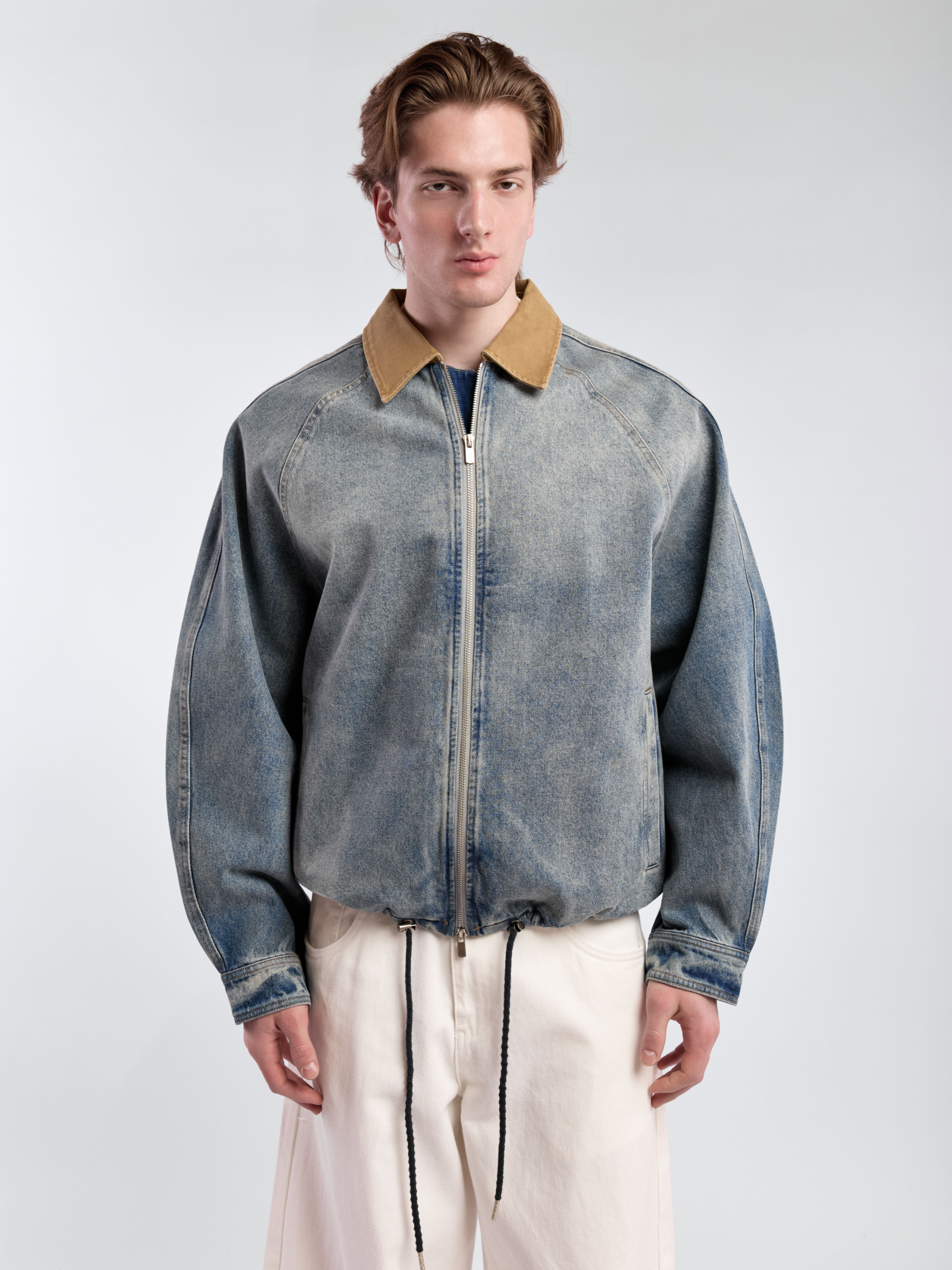 Джинсовая куртка О-силуэта с контрастным воротником