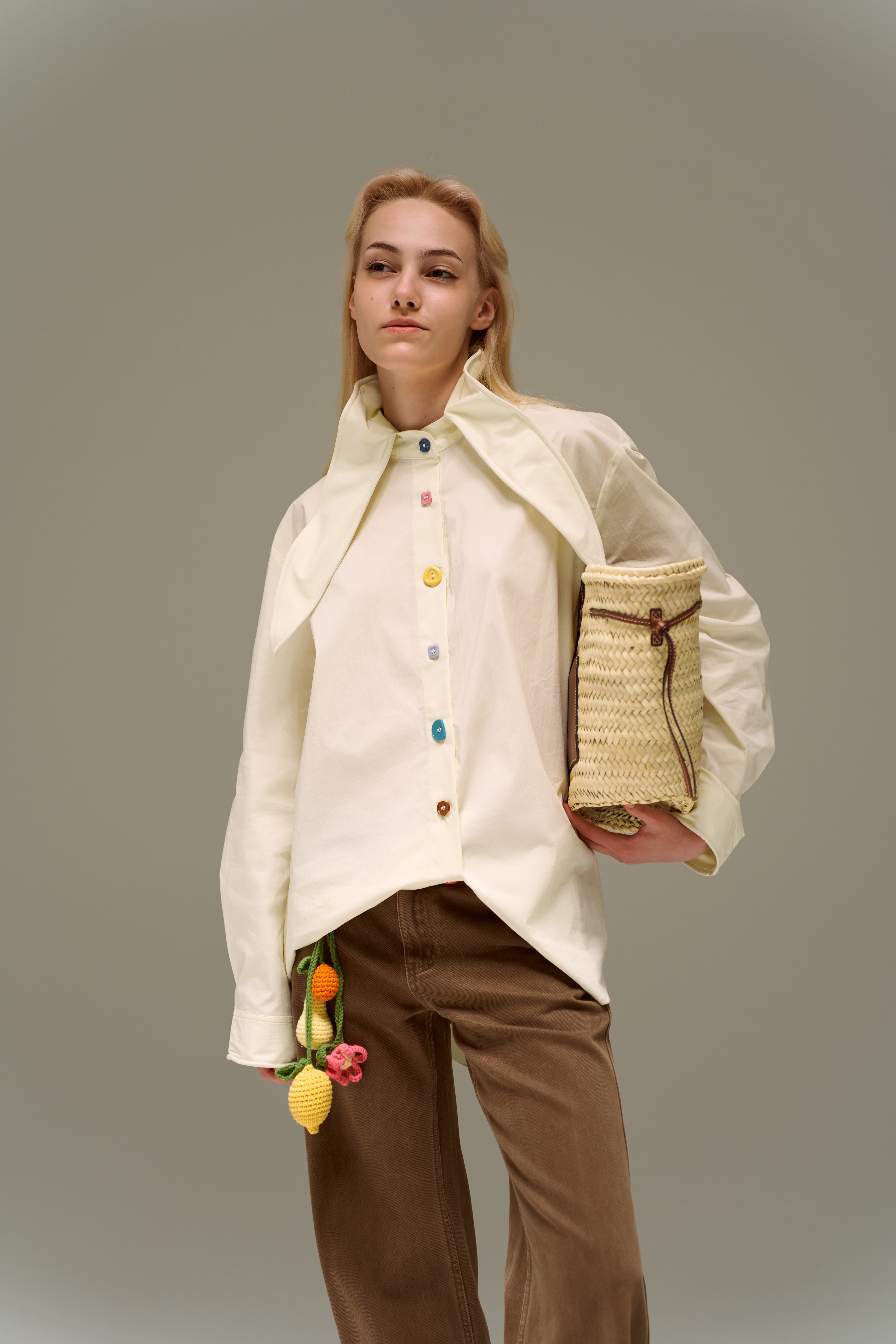 Рубашка Bunny свободного кроя, с акцентными пуговицами, напоминающими леденцы разной формы. Главная особенность этой модели — это воротник в виде заостренных лент с проволокой внутри, напоминающие заячьи ушки. В манжетах рукавов также есть гнущийся каркас. Благодаря этому ворот и манжеты можно гнуть, создавать новые формы и детали, что станет вашим главным акцентом в образе. Изделие выполнено из смесовой ткани.