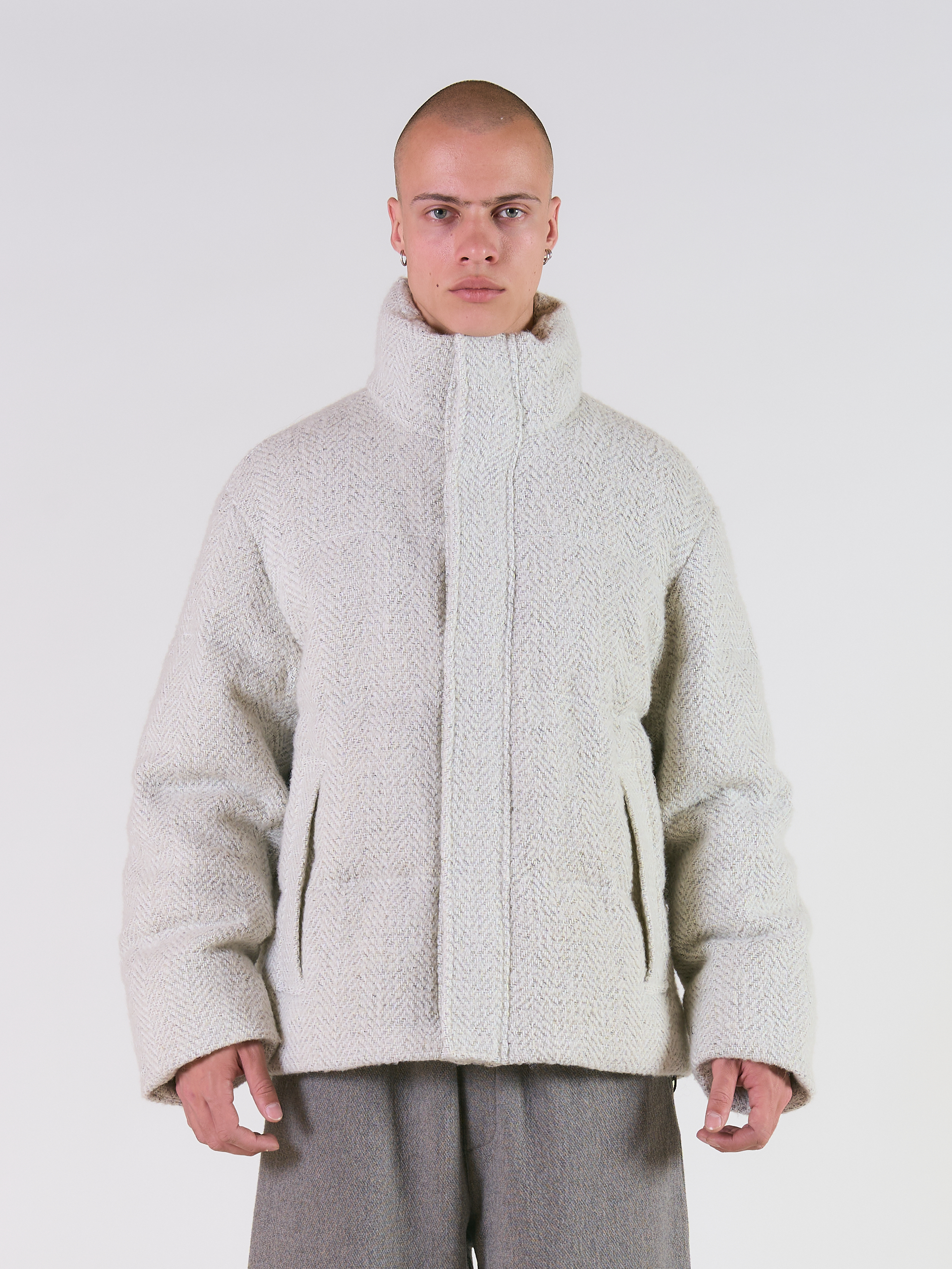 Укороченная куртка из шерсти с высоким воротником-стойка и натуральным наполнителем. Застежка на молнию и планку с кн опками по всей длине. Длинные прямые рукава со спущенной линией плеча и манжетами на резинке. Два прорезных кармана по бокам без застежки. Утяжки со стопперами по бокам внутри. Можно носить до -15-20 градусов с теплым свитером.