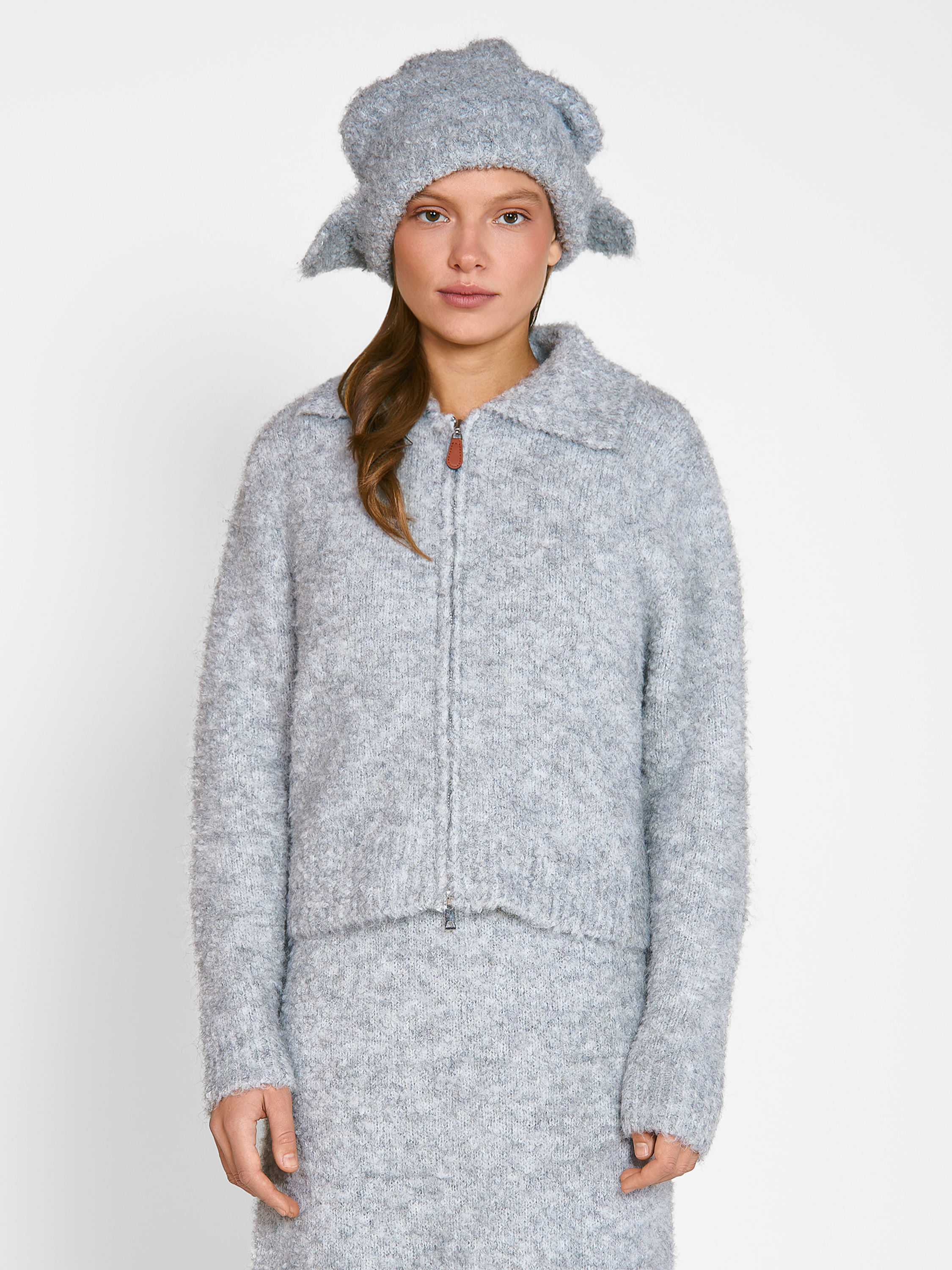 Джемпер Lana свободного кроя с отложным воротником, на молнии. Модель выполнена из кудрявой и мягкой пряжи с добавлением шерсти. Укороченный силуэт. Параметры модели Рост: 170 см Грудь - 80 см, талия - 60 см, бедра - 89 см Размер на модели: ONE SIZE