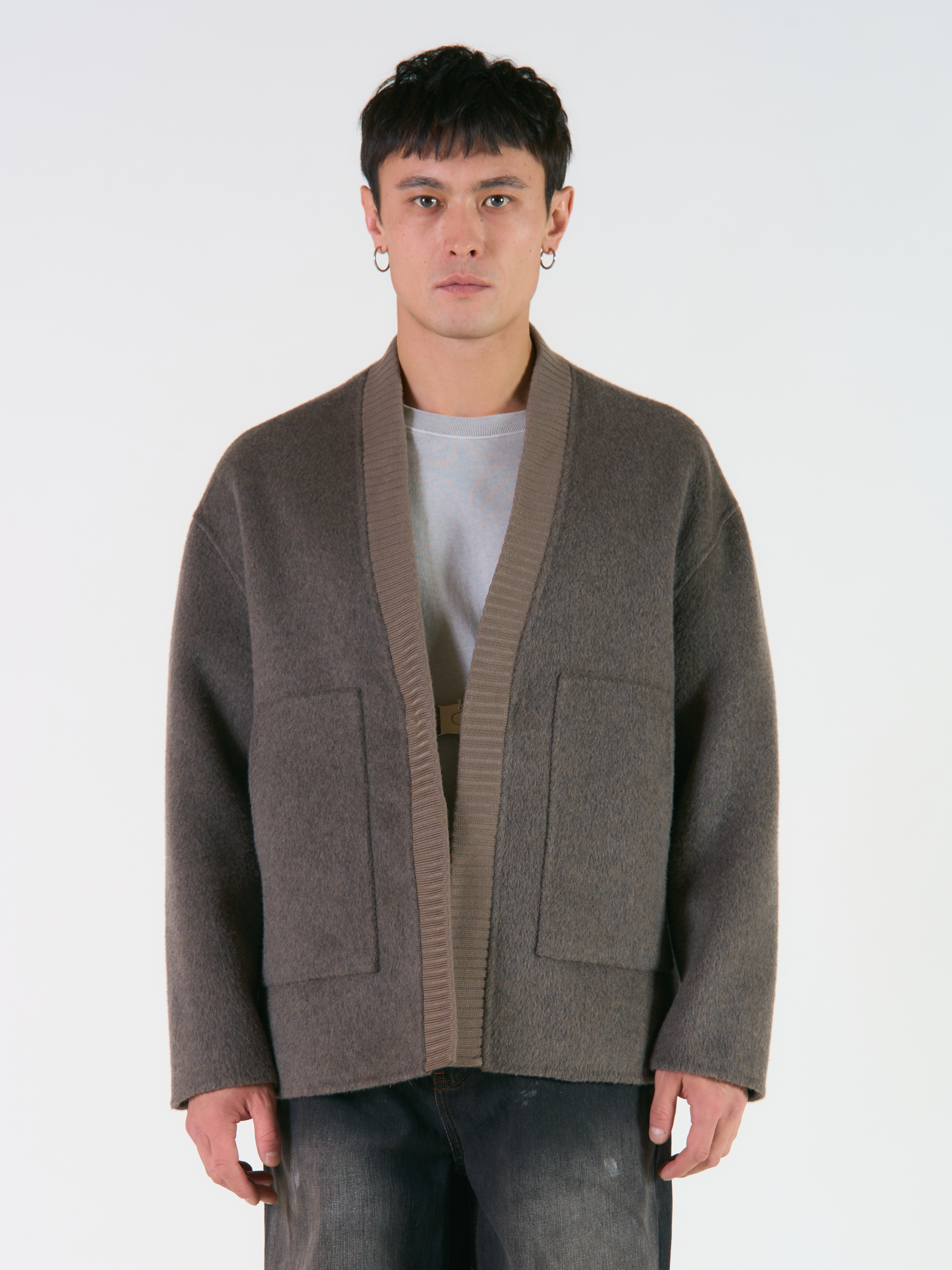 Кардиган-кимоно свободного кроя из мягкой ткани с шерстью. Стильный силуэт с акцентом в виде застежки-карабина. Передние накладные карманы, длинные рукава.