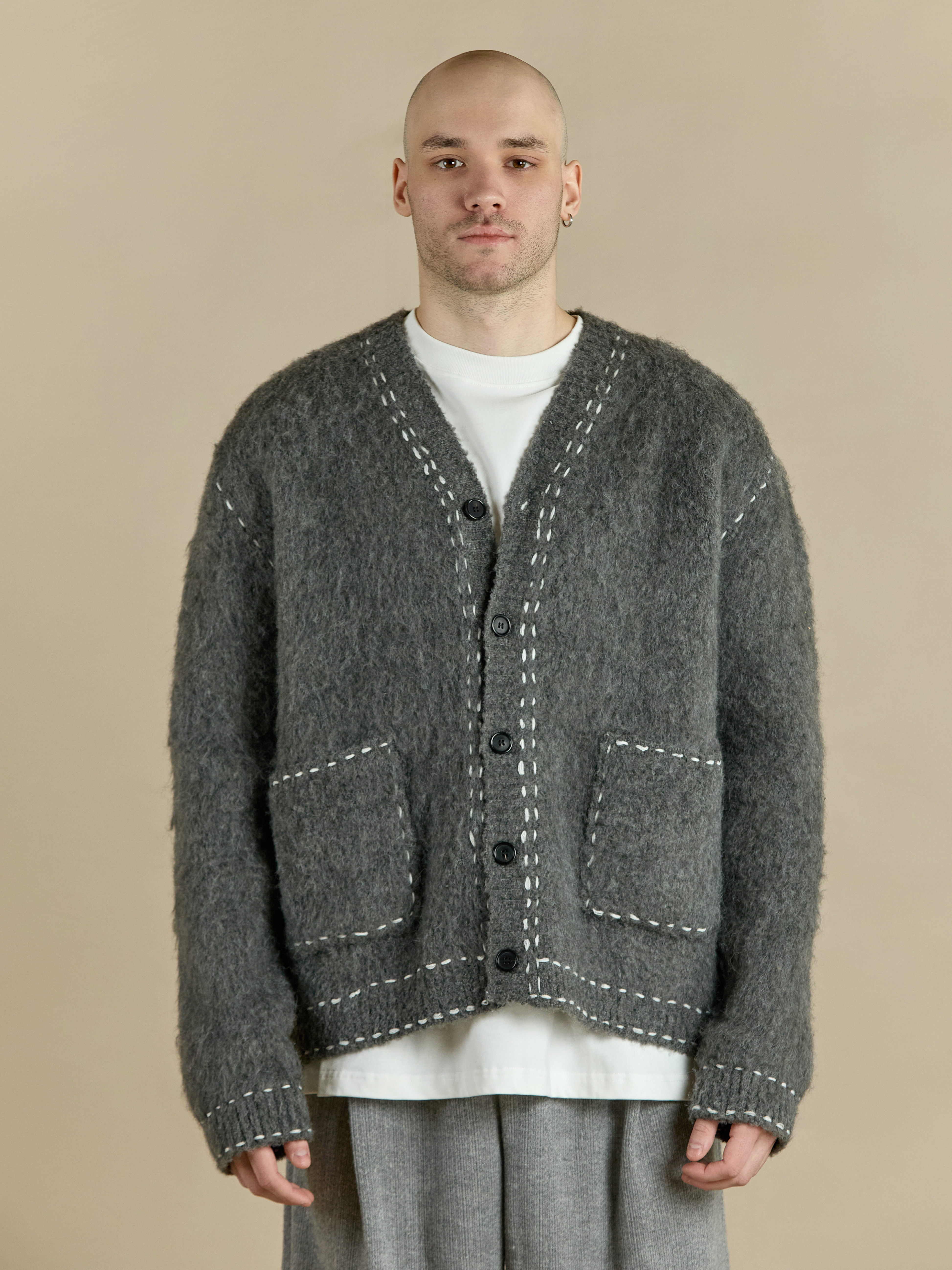 Кардиган свободного кроя из мягкой рельефной ткани с шерстью. V-образный вырез и длинные рукава. Стильный силуэт с декоративным элементом в виде контрастного шва. Передние накладные карманы. Застегивается на пуговицы.