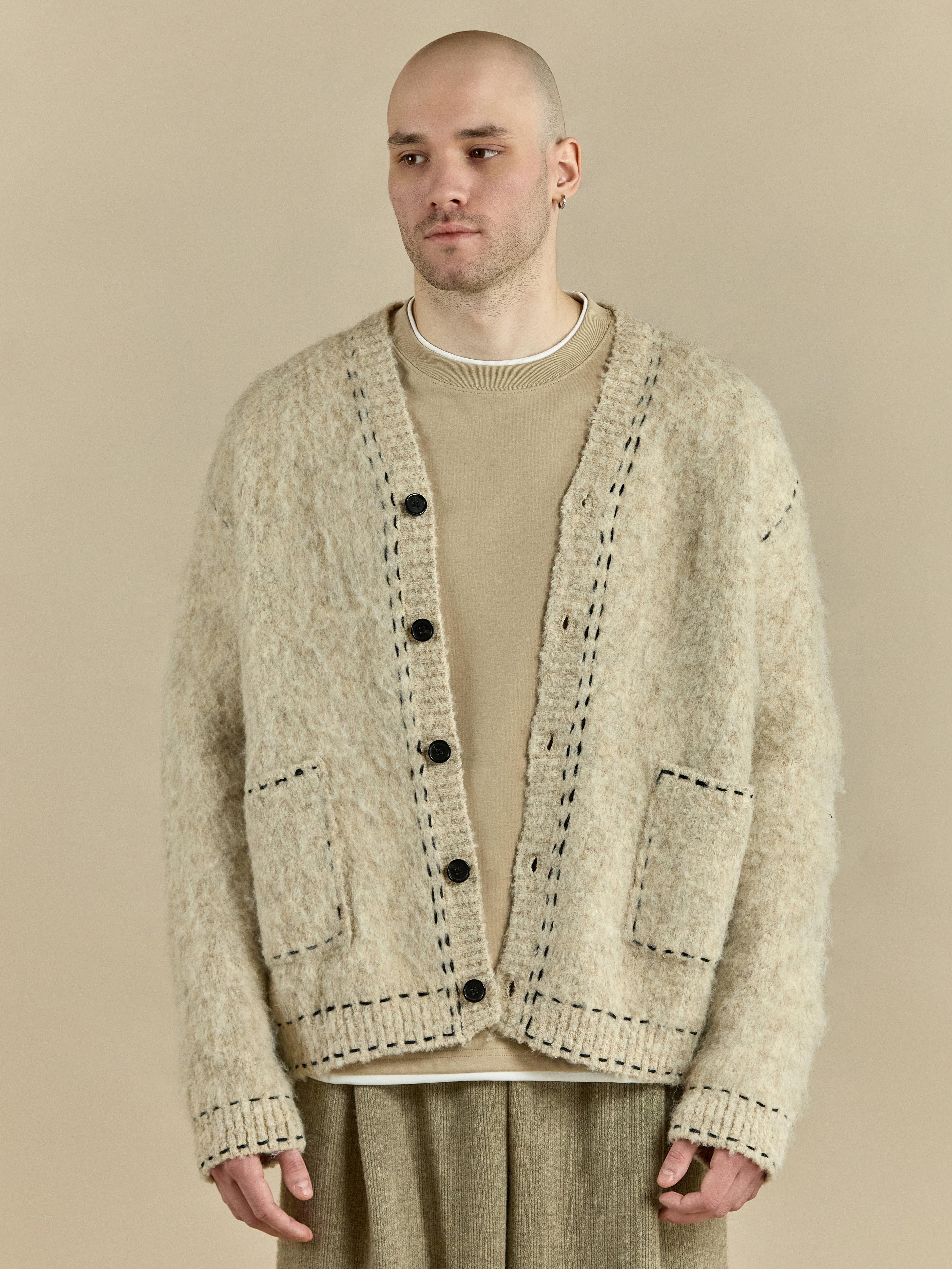 Кардиган свободного кроя из мягкой рельефной ткани с шерстью. V-образный вырез и длинные рукава. Стильный силуэт с декоративным элементом в виде контрастного шва. Передние накладные карманы. Застегивается на пуговицы.