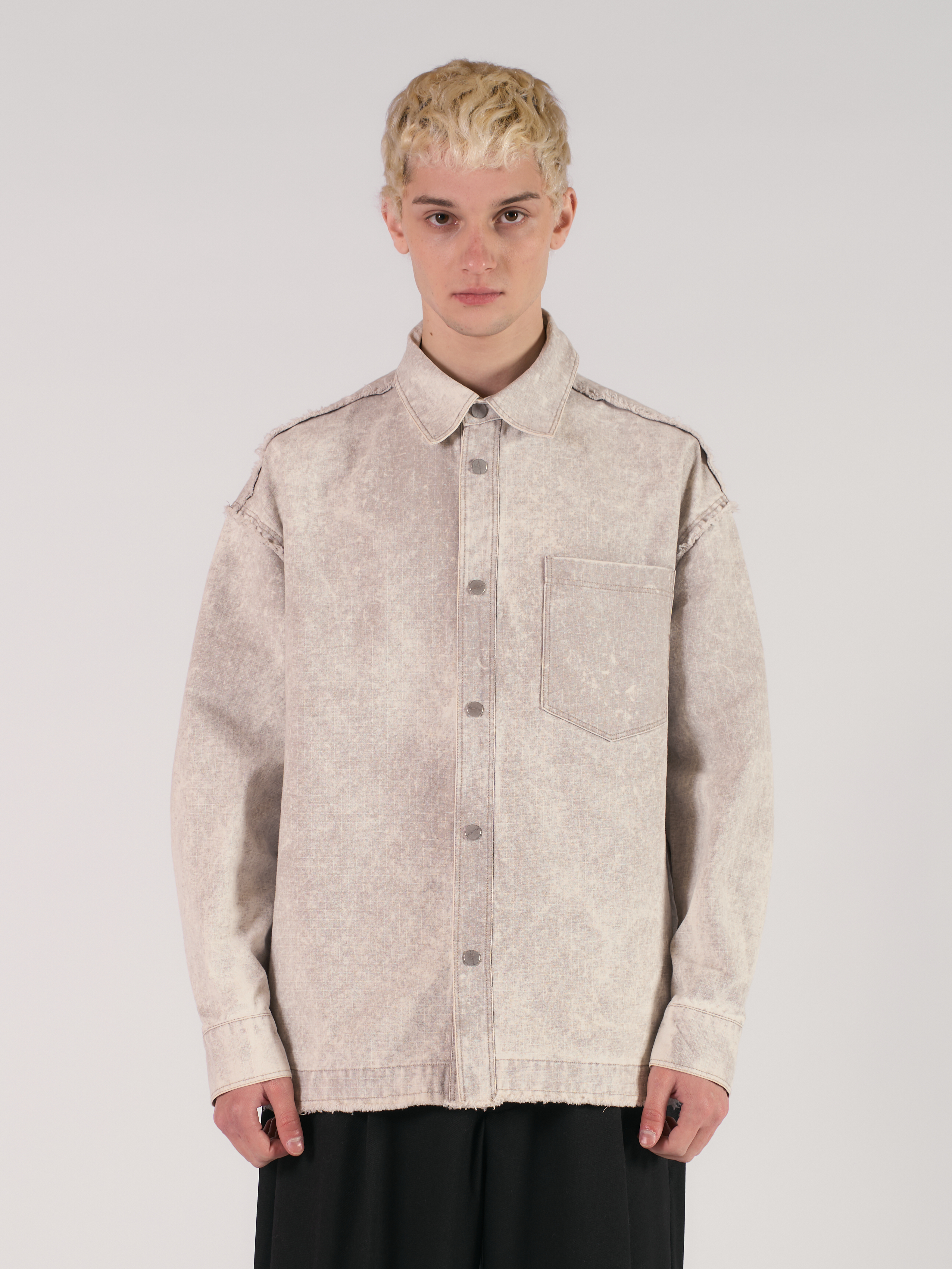 Джинсовая рубашка Overexposed свободного кроя, с необработанными краями и швами по всему изделию. Рубашка выполнена из плотной вареной джинсы с выстиранным эффектом. На передней части расположен один нагрудный карман. Тип застежки — пуговицы. Параметры модели Рост: 180 см Грудь – 94 см, талия - 72 см, бедра - 91 см Размер на модели: L