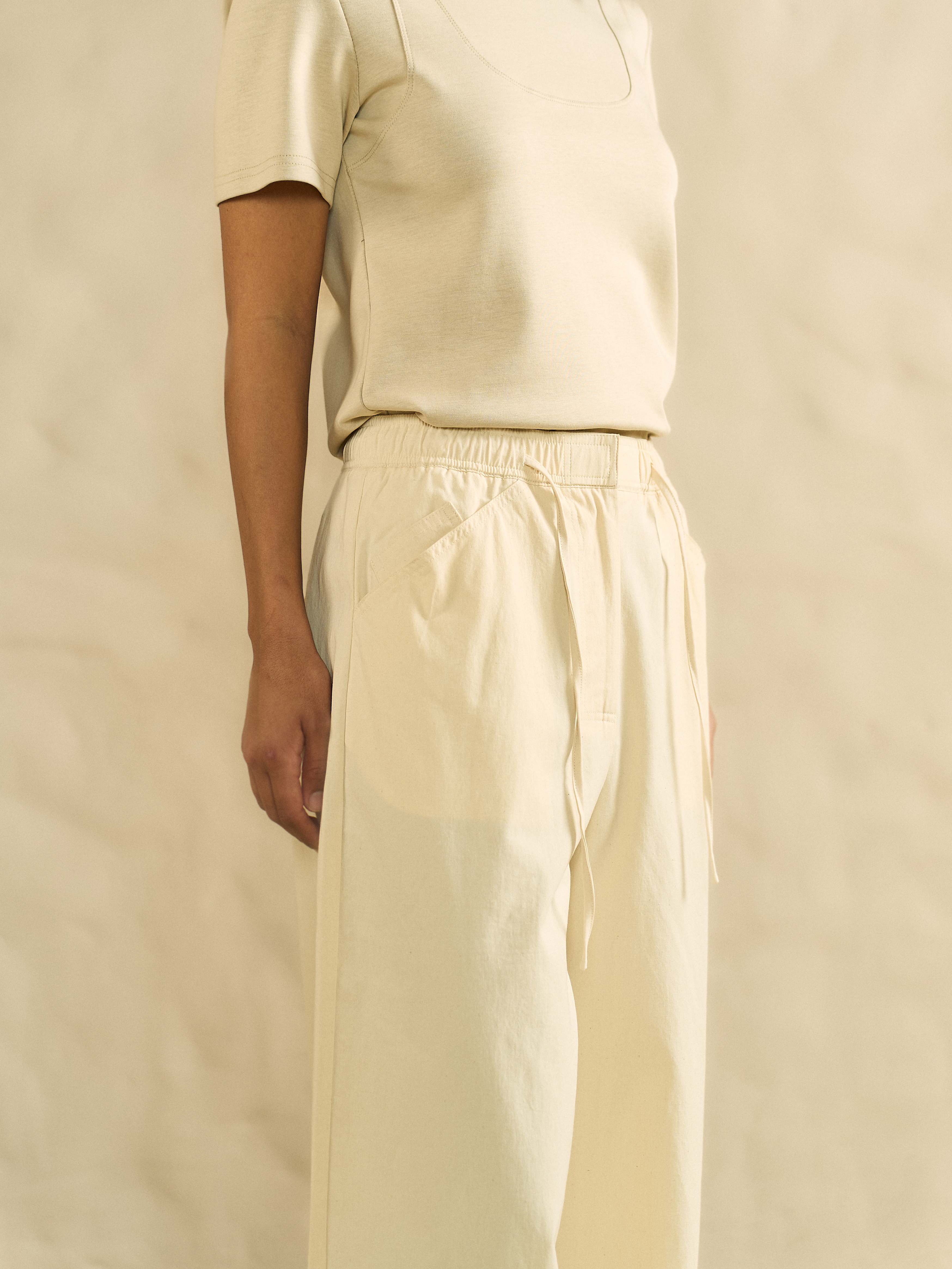 Джоггеры из смесовой ткани, наличие в составе волокон конопли, материал имеет такие свойства, как: долговечность, воздухопроницаемость, гигроскопические свойства, гипоаллергенность и сохранение формы и стойкости волокон. Пояс изделия выполнен на резинке с кулисками для регулирования прилегаемости к телу. Низ брюк также выполнен на резинке. Тип застежки — молния и внутренний металлический крючок. На передней части три передних прорезных кармана.