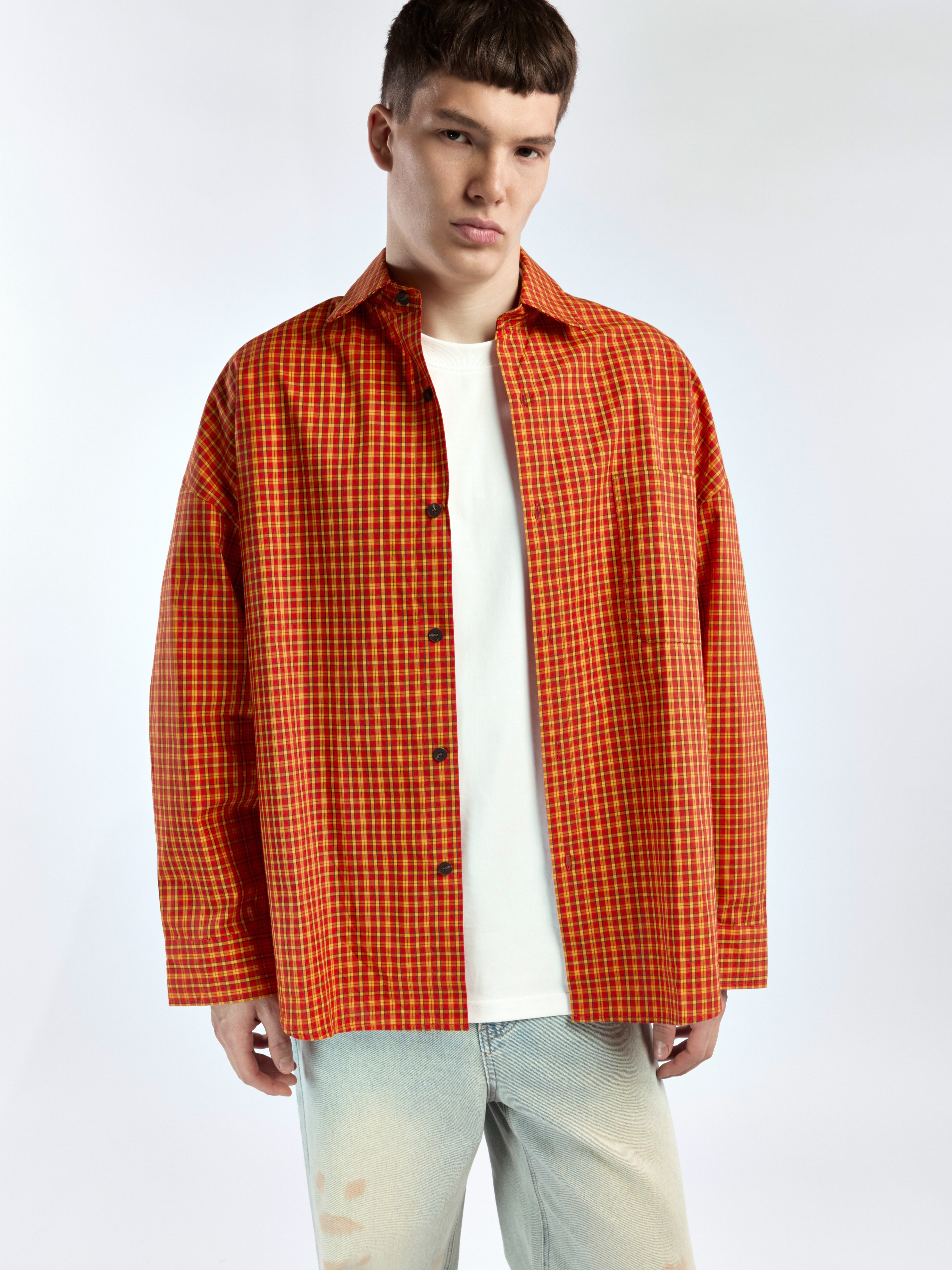 Рубашка широкого кроя с нагрудным карманом. Модель выполнена из хлопковой ткани средней плотности, застегивается на акцентные пуговицы. Параметры модели Рост: 189 см Грудь – 103 см, талия - 79 см, бедра - 97 см Размер на модели: L