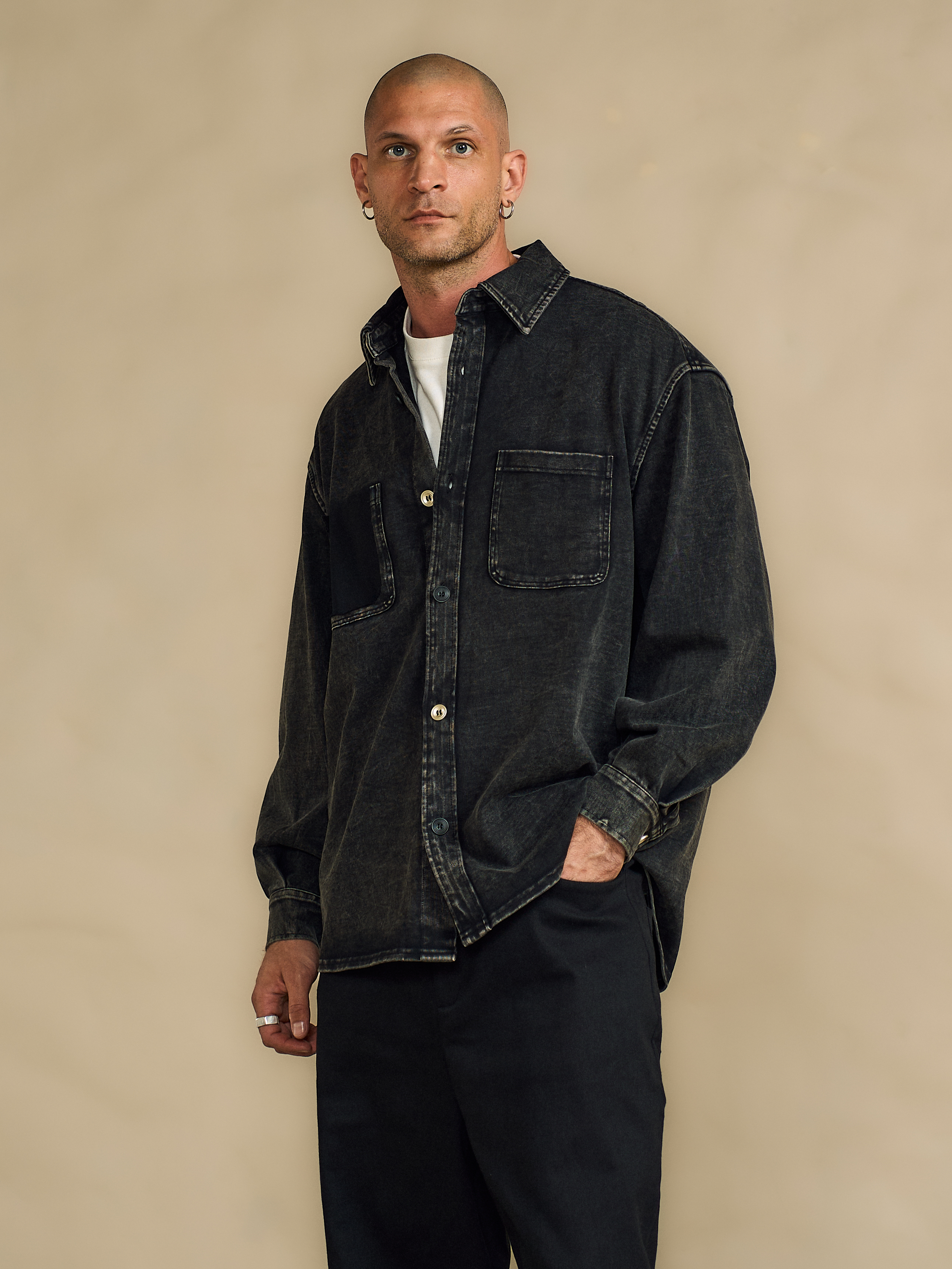 Хлопковая рубашка с отложным воротником и длинными рукавами. Акцентные детали: два вида пуговиц, декоративный карман с потертостями.