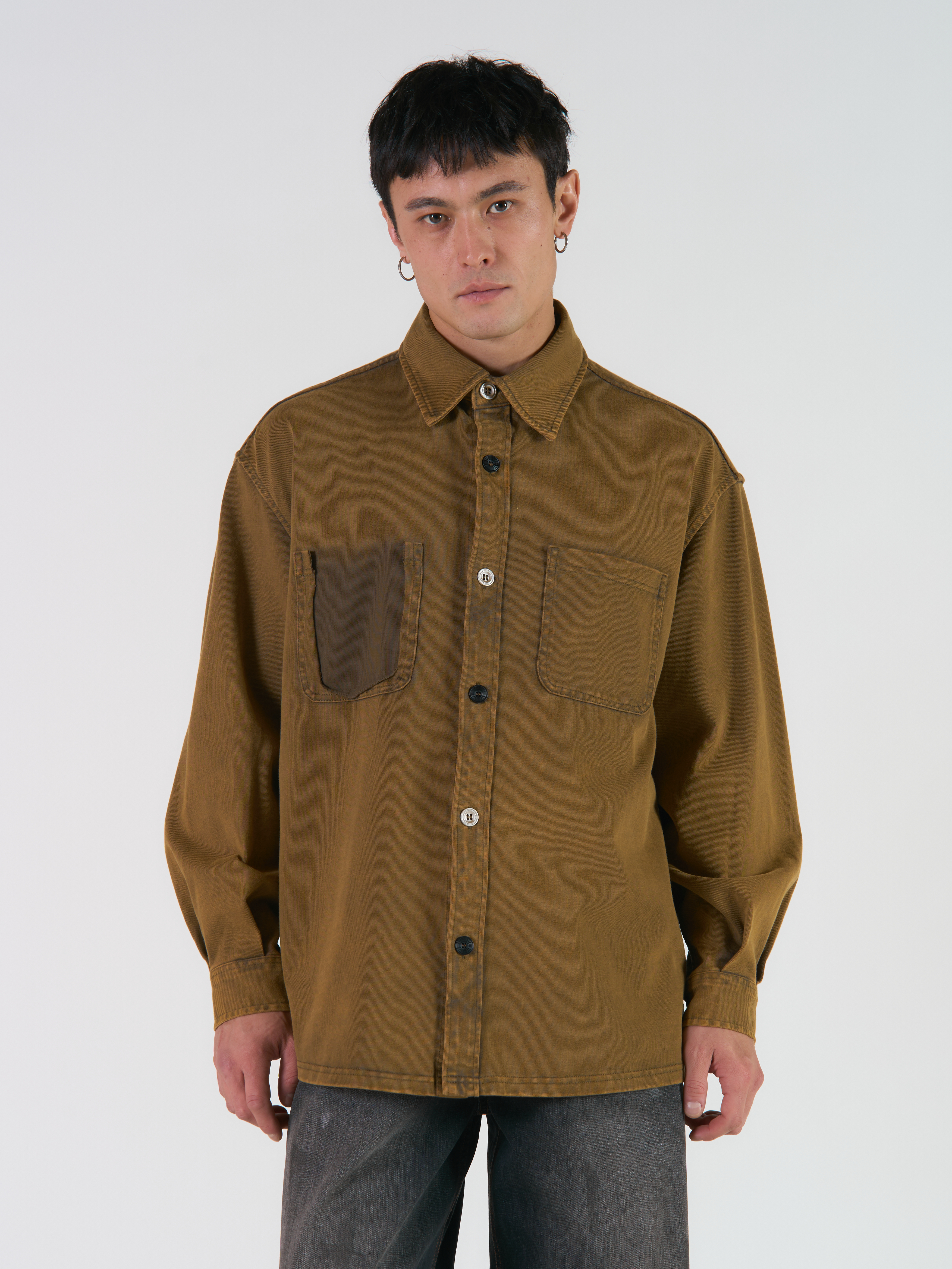 Хлопковая рубашка с отложным воротником и длинными рукавами. Акцентные детали: два вида пуговиц, декоративный карман с потертостями.