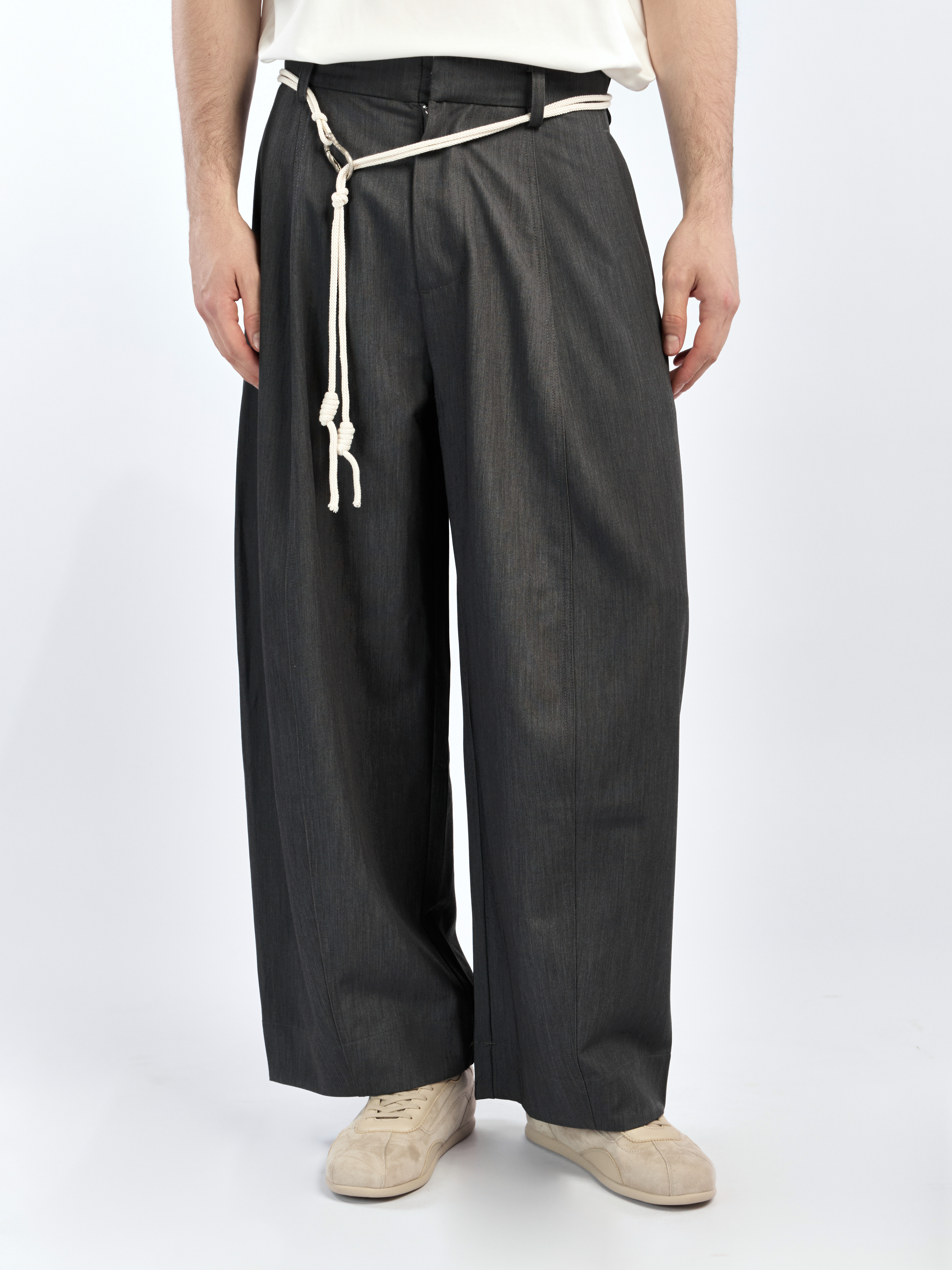 Брюки широкого кроя, О-силуэта с выточками для придания формы. Модель выполнена из смесовой костюмной ткани со струящимся эффектом. В комплекте идет пояс из белого шнура с карабином. Два боковых прорезных кармана и один задний с треугольным клапаном. Параметры модели Рост: 189 см Грудь – 103 см, талия - 79 см, бедра - 97 см Размер на модели: ХL