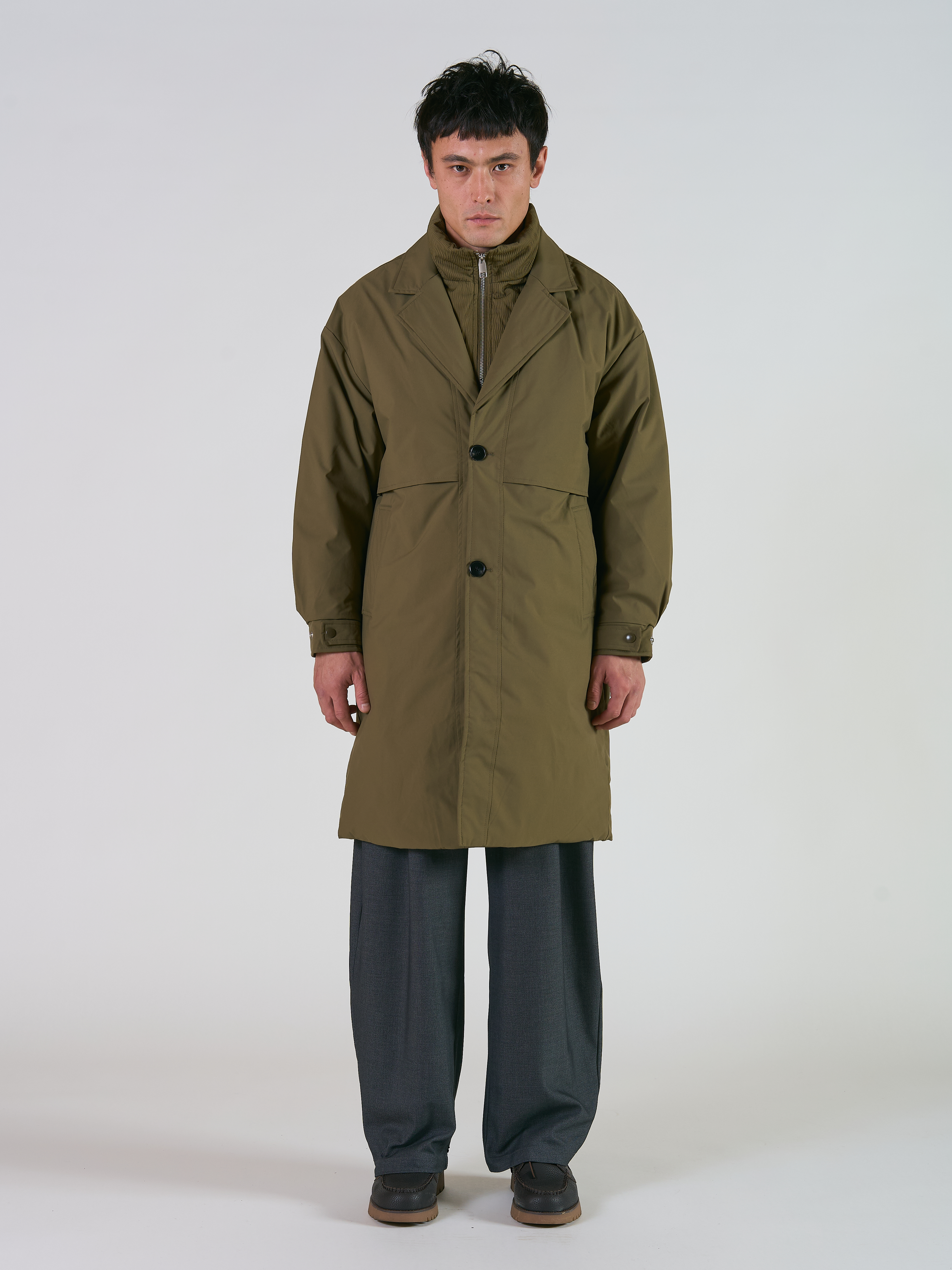 Пуховик изготовлен из прочной ткани, которая защищает от влаги. За тепло отвечает наполнитель из натурального утиного пуха. Модель прямого силуэта, имеет воротник-стойку с лацканами, два прорезных кармана.