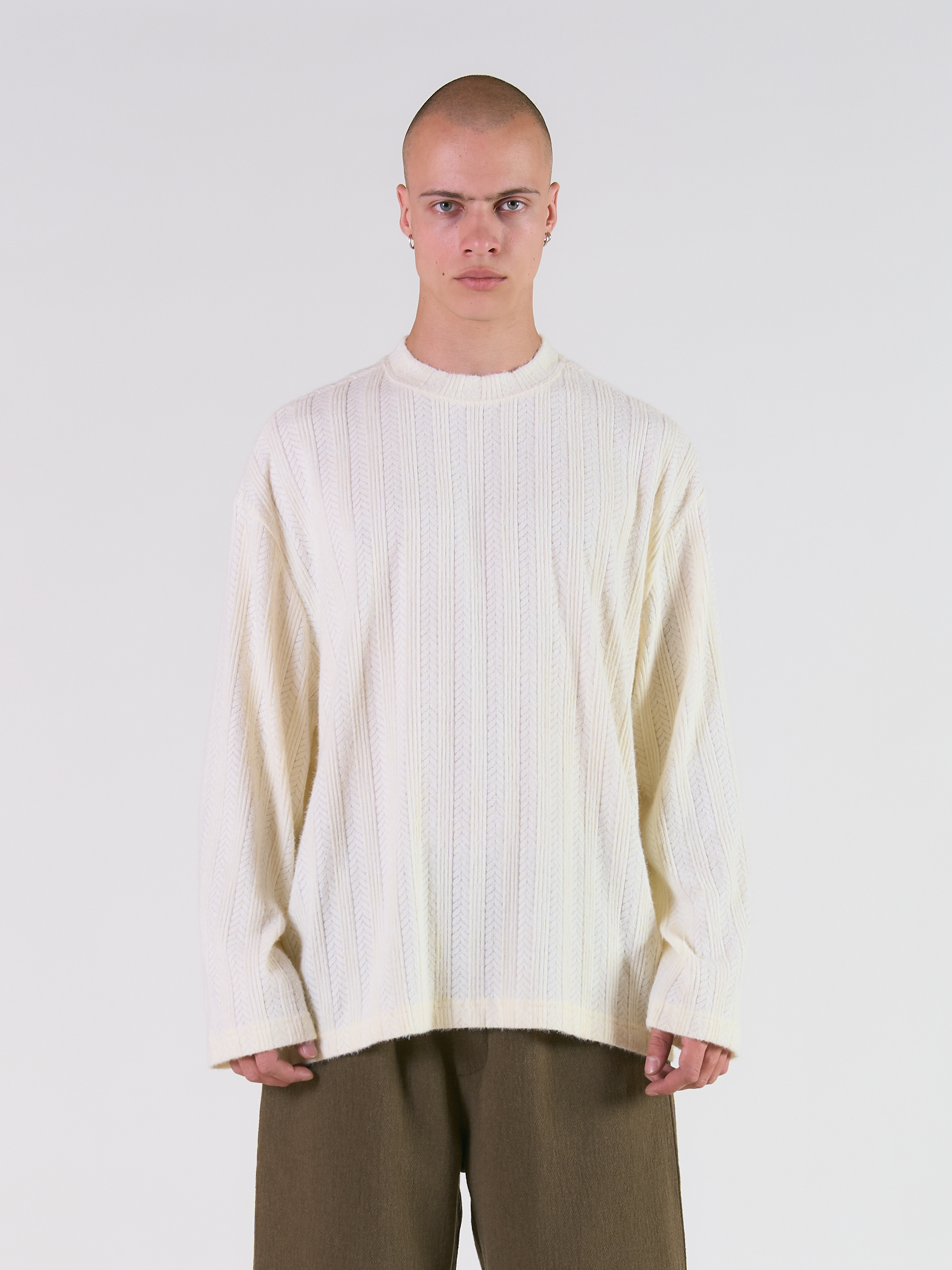 Лонгслив прямого силуэта в вертикальную полоску. Спущенная линия плеча, круглый вырез и длинные рукава.