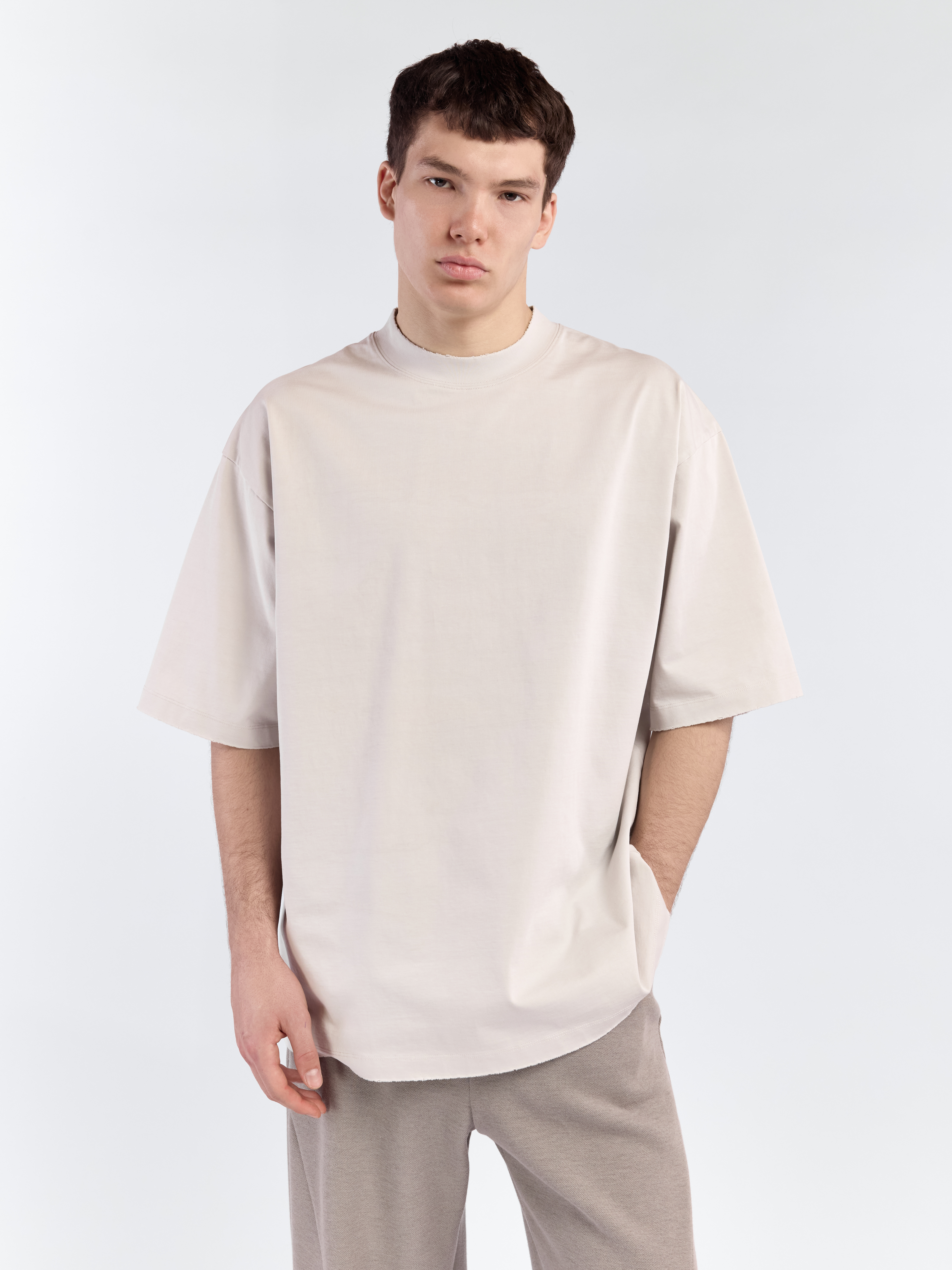 Футболка с необработанными краями, свободного кроя и приспущенной линией плеча. Модель выполнена из хлопковой ткани средней плотности и гладкой фактурой. Параметры модели Рост: 189 см Грудь – 103 см, талия - 79 см, бедра - 97 см Размер на модели: L