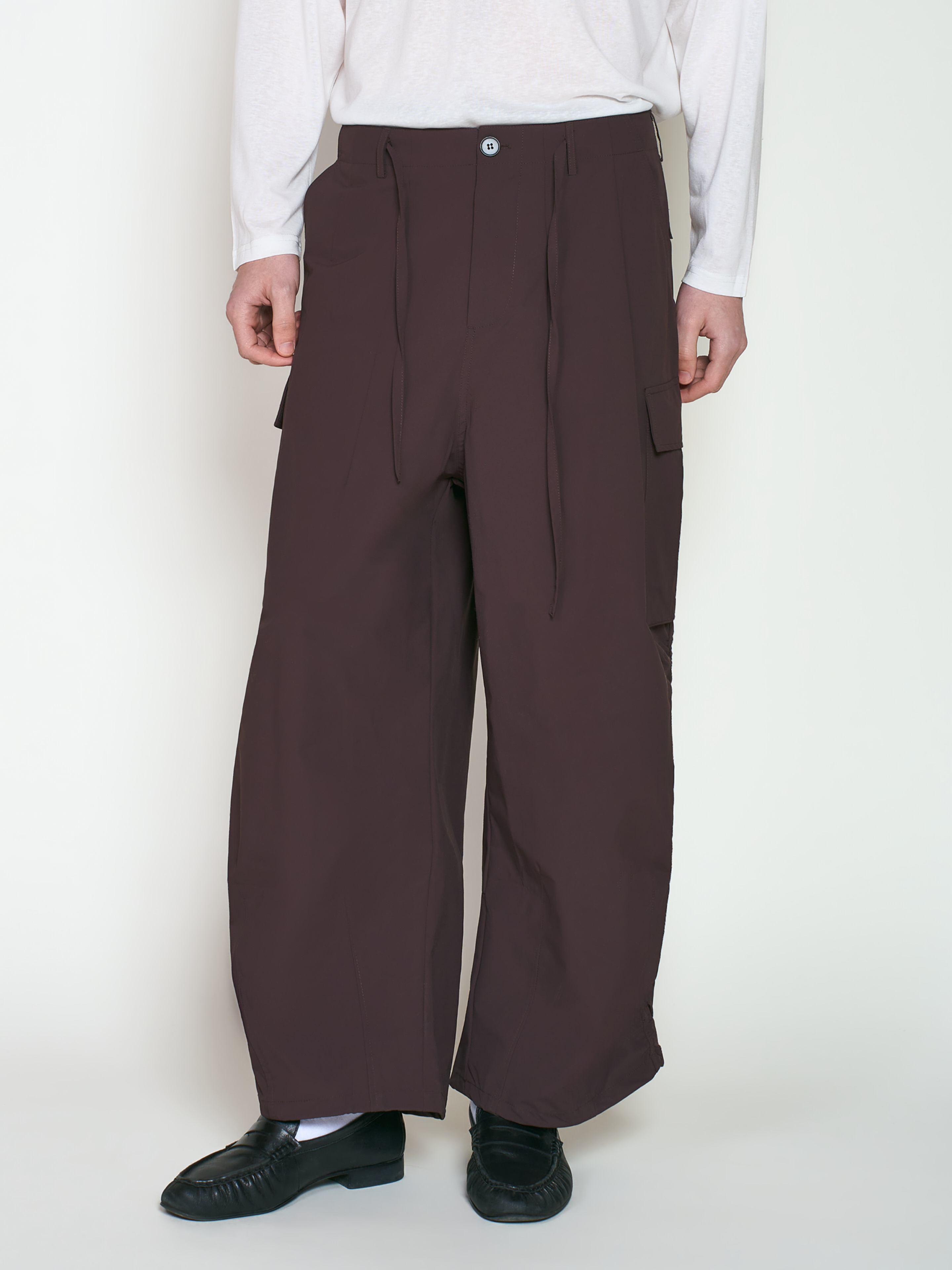 Брюки карго свободного кроя. Модель выполнена из мягкой плащевой ткани. Два боковых прорезных кармана и два накладных с клапаном. Застегивается на пуговицу и молнию, также пояс регулируется кулисками.