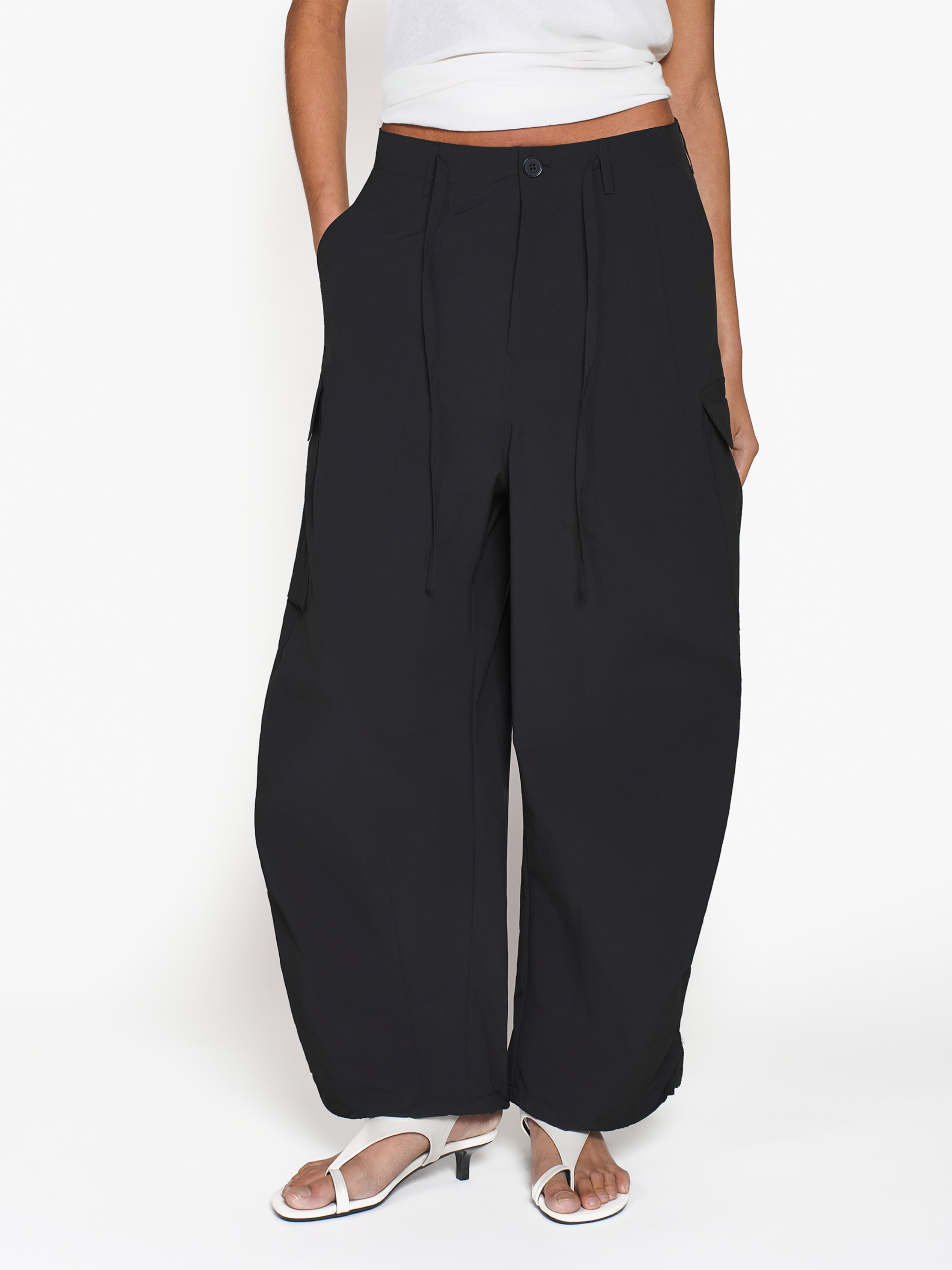 Брюки карго свободного кроя. Модель выполнена из мягкой плащевой ткани. Два боковых прорезных кармана и два накладных с клапаном. Застегивается на пуговицу и молнию, также пояс регулируется кулисками.
