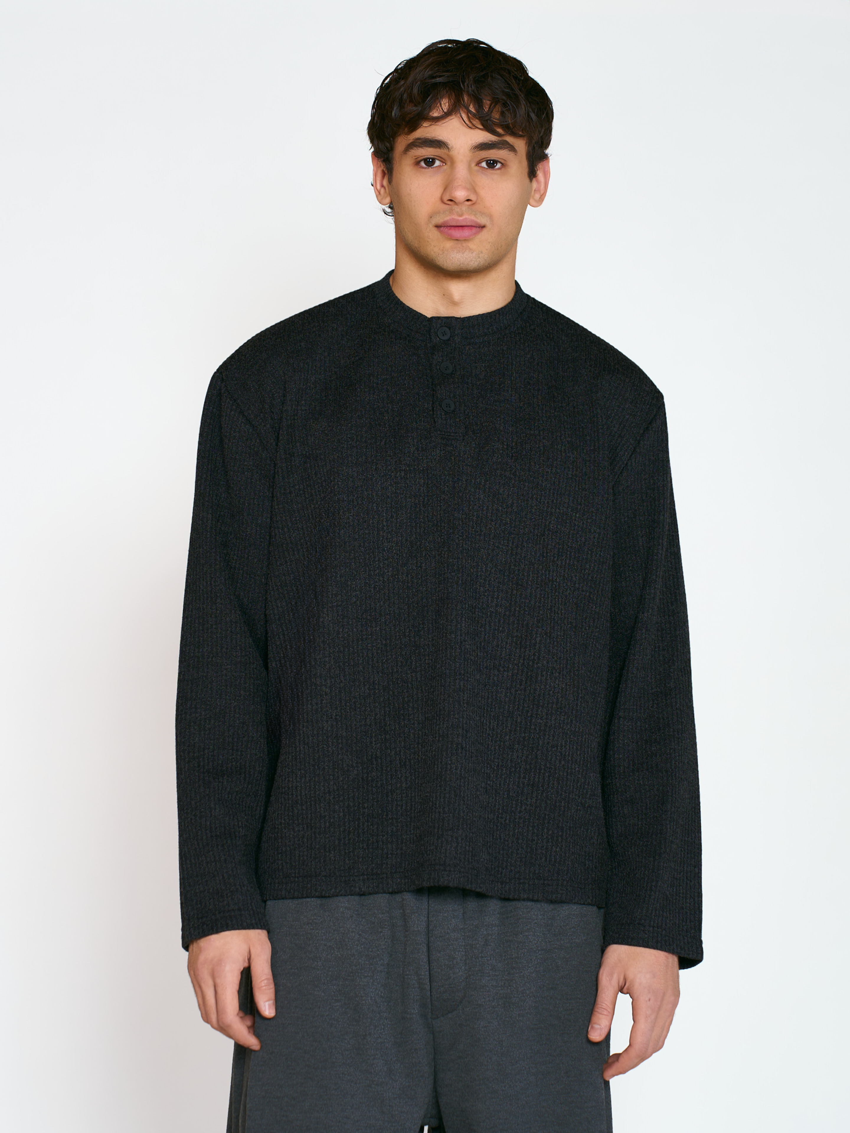Лонгслив Yoru свободного кроя, с пуговицами до середины груди. Модель выполнена из смесовой трикотажной ткани с имитацией шерсти, в рубчик. Параметры модели Рост: 188 см Грудь – 105 см, талия - 70 см, бедра - 93 см Размер на модели: L