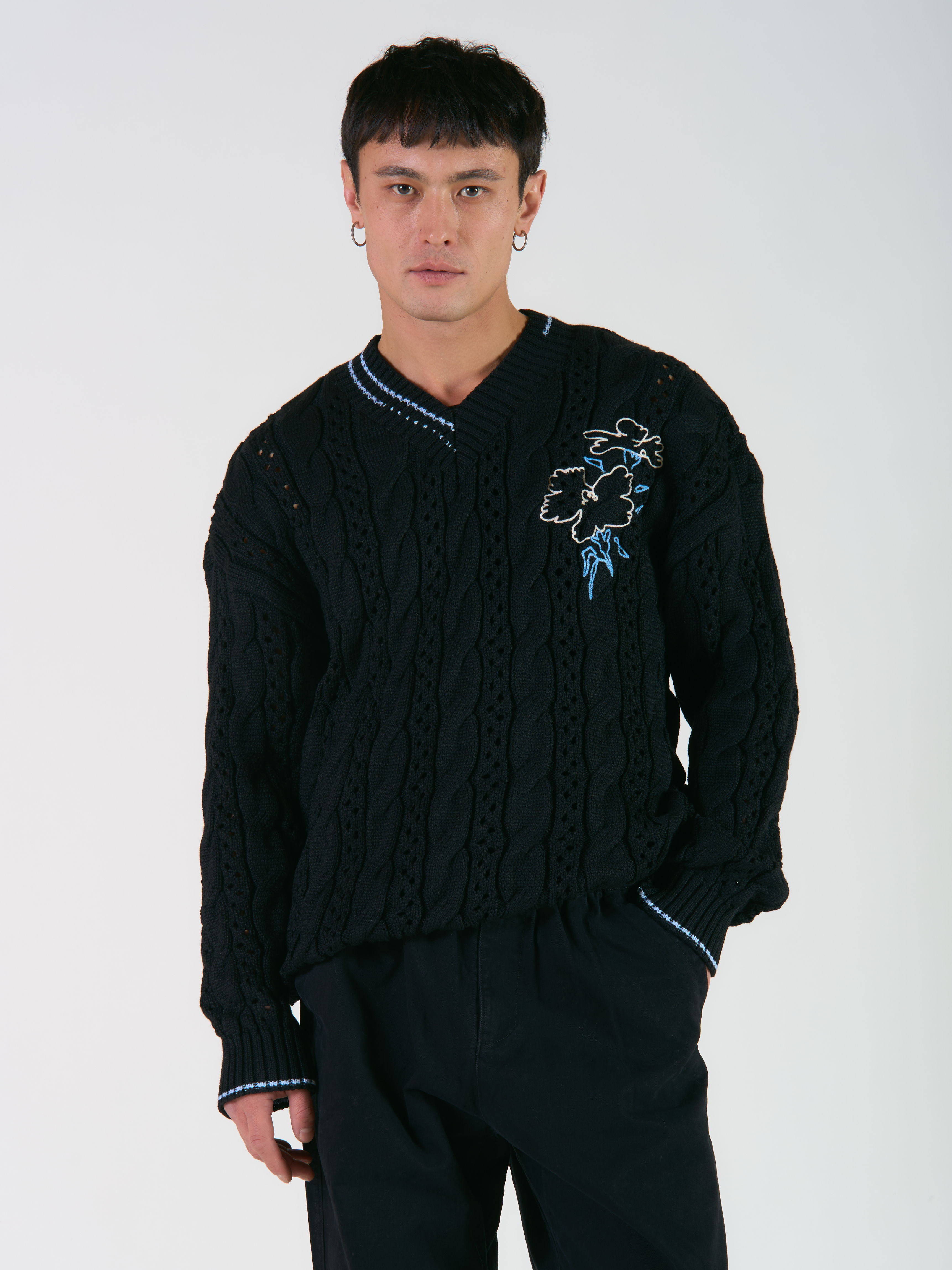 Вязаный пуловер с V-образным вырезом. Декоративные элементы в виде перфорации, рисунка и строчки.