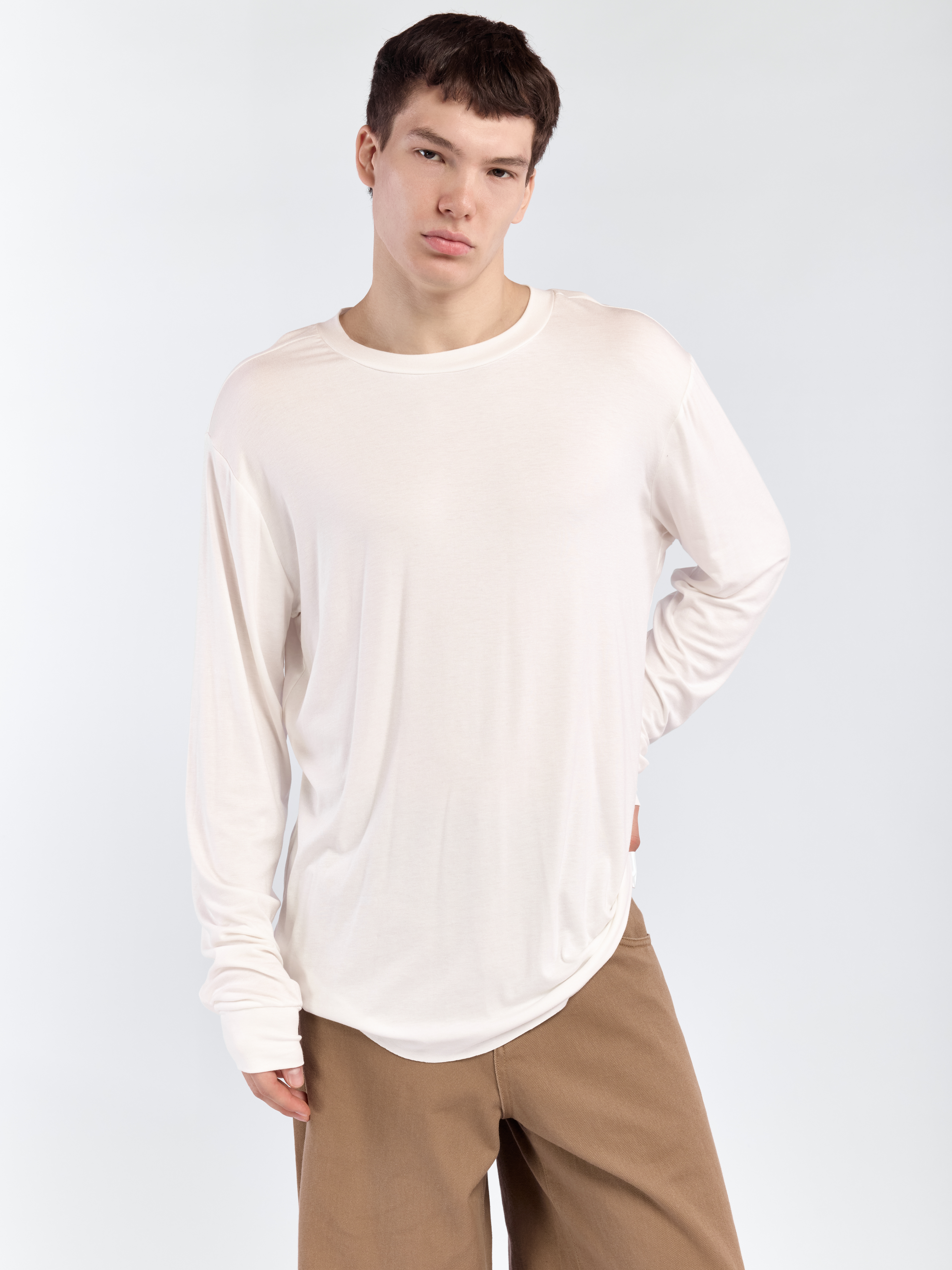 Лонгслив свободного кроя с облегающими длинными рукавами. Изделие выполнено из мягкой вискозы со струящимся эффектом. Параметры модели Рост: 180 см Грудь - 90 см, талия - 75 см, бедра - 87 см Размер на модели: L