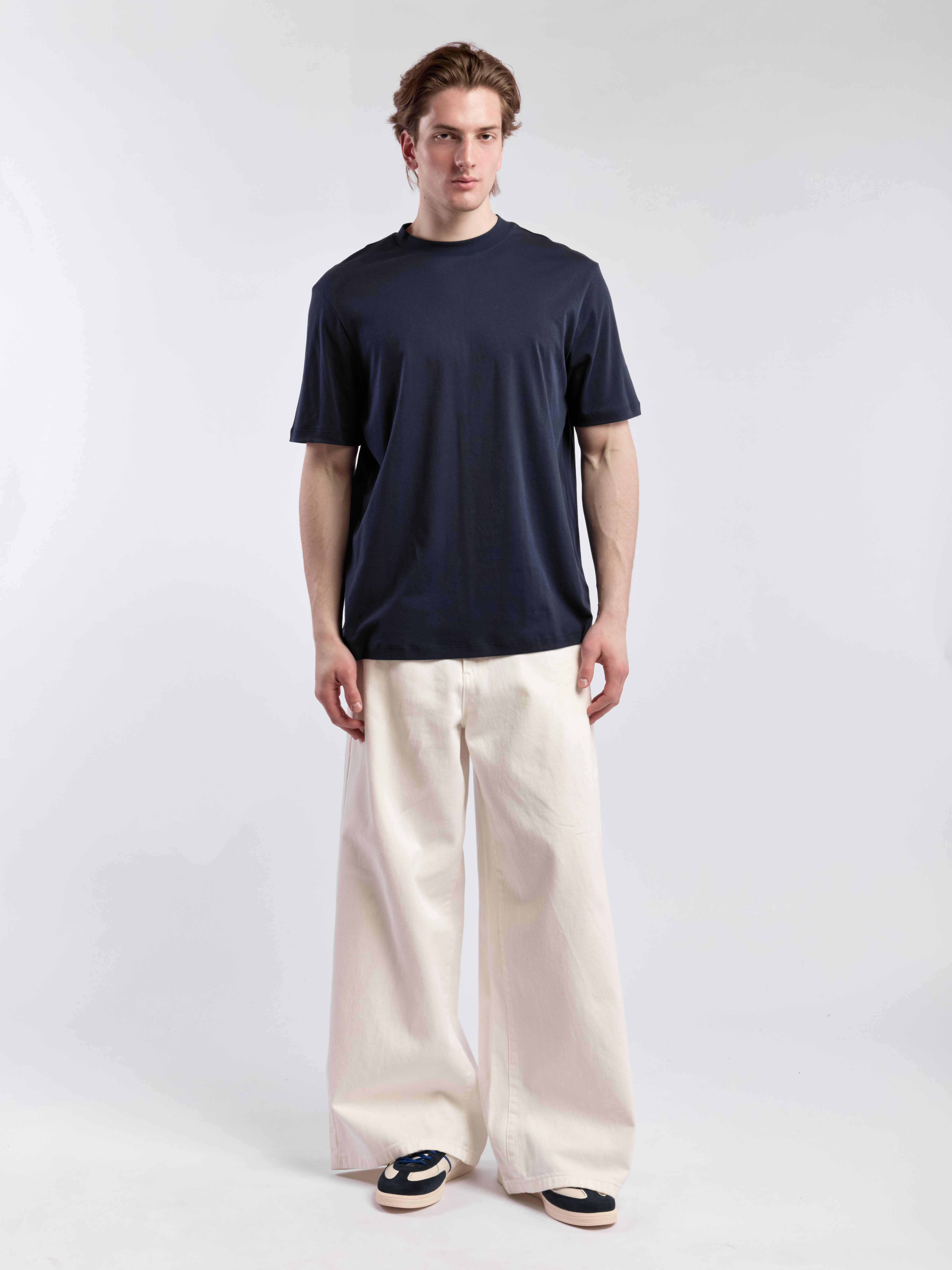 Футболка свободного кроя. Модель выполнена из премиального хлопка с гладкой фактурой и струящимся эффектом. Параметры модели Рост: 189 см Грудь – 103 см, талия - 79 см, бедра - 97 см Размер на модели: L