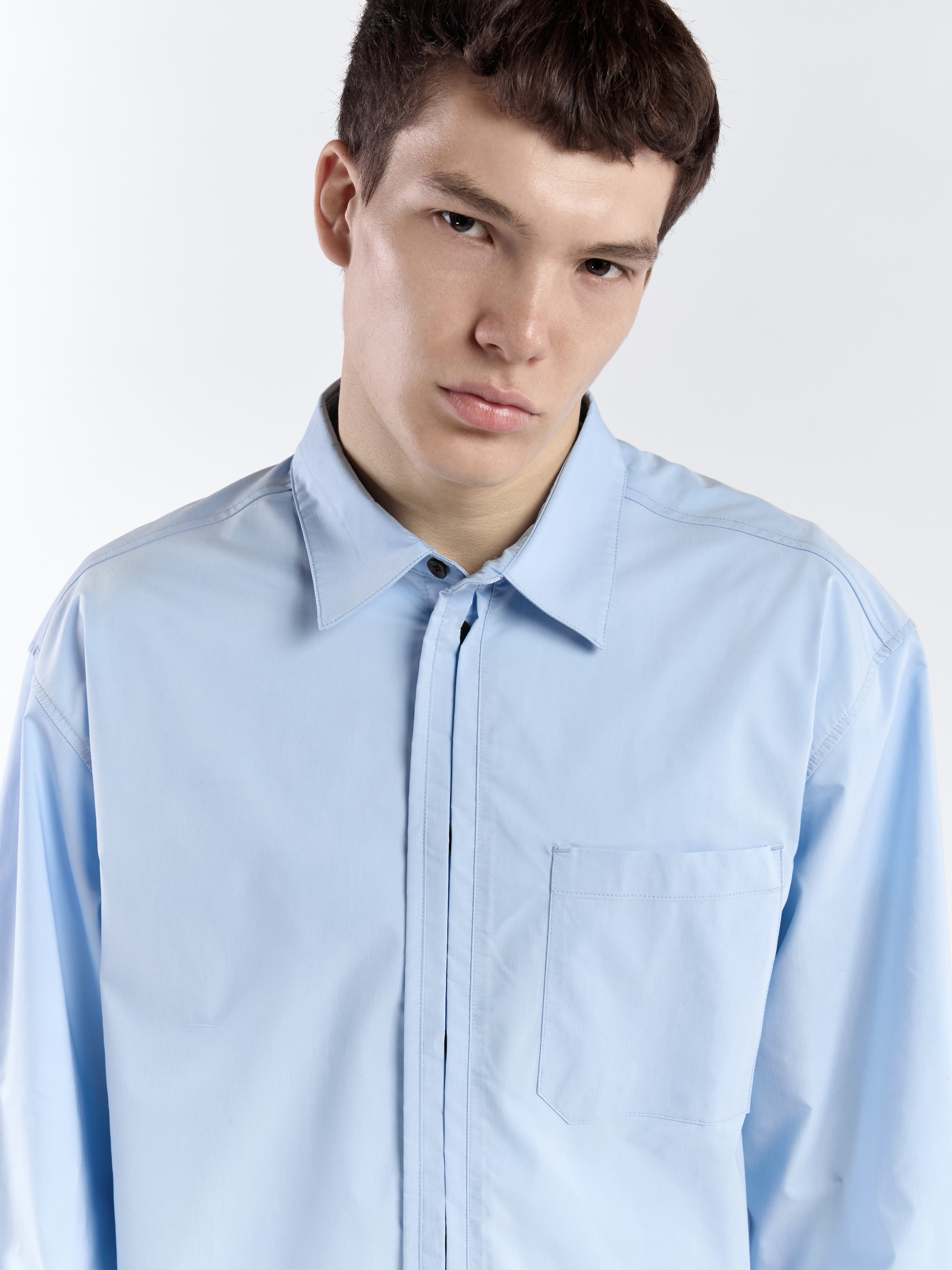 Рубашка свободного кроя со скрытыми пуговицами. Модель выполнена из смесовой ткани с матовой фактурой. На передней части расположен один нагрудный карман. Параметры модели Рост: 189 см Грудь – 103 см, талия - 79 см, бедра - 97 см Размер на модели: L