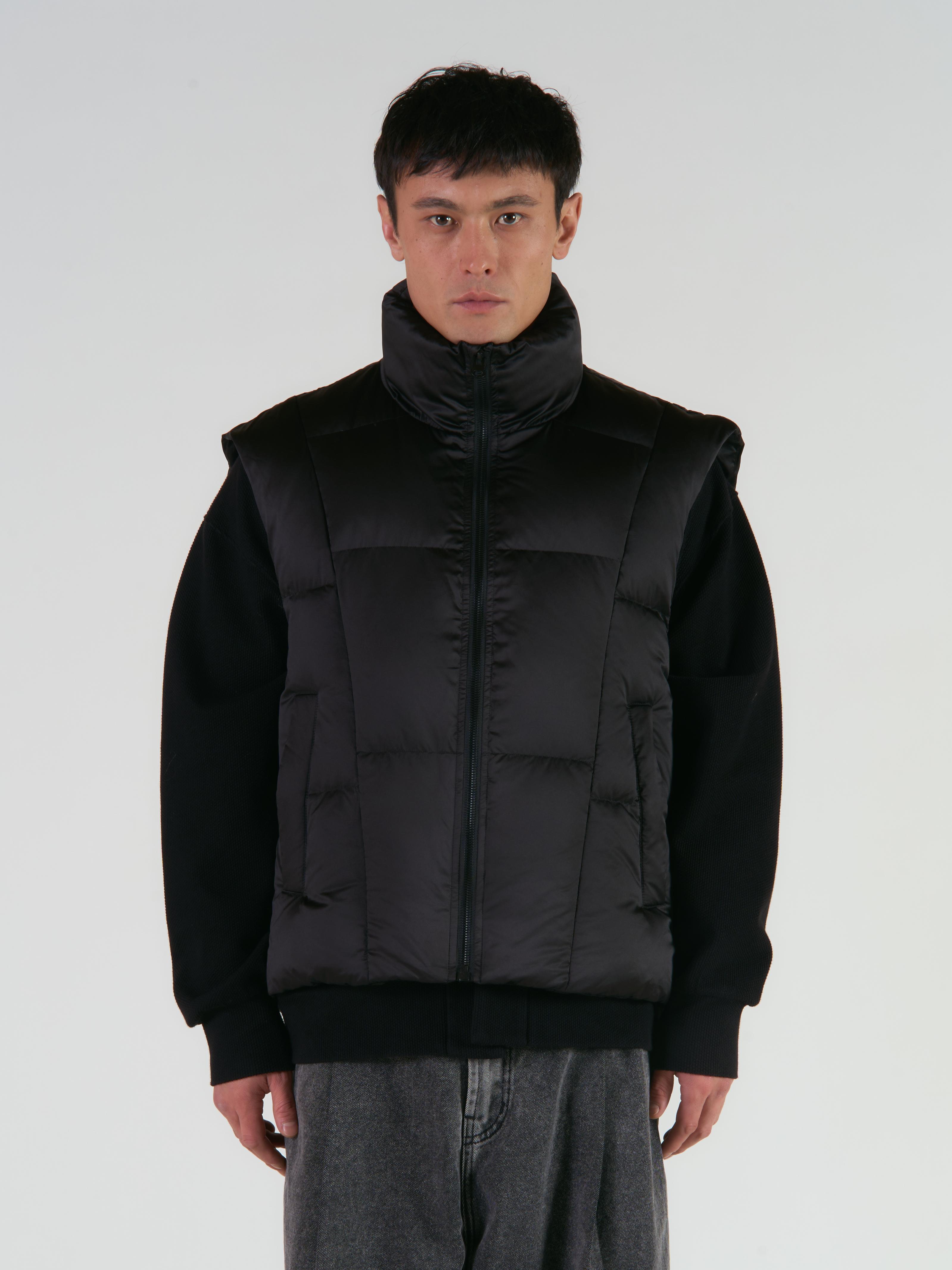 Стеганый жилет объемного кроя и ассиметричного силуэта. Внешний вид немного напоминает панцирь бл агодаря своей форме. Изделие выполнено из тонкой плащевой ткани с эффектом глянца. Два боковых прорезных кармана и один внутренний, тип застежки — молния. Параметры модели Рост: 180 см Грудь - 90 см, талия - 75 см, бедра - 87 см Размер на модели: М