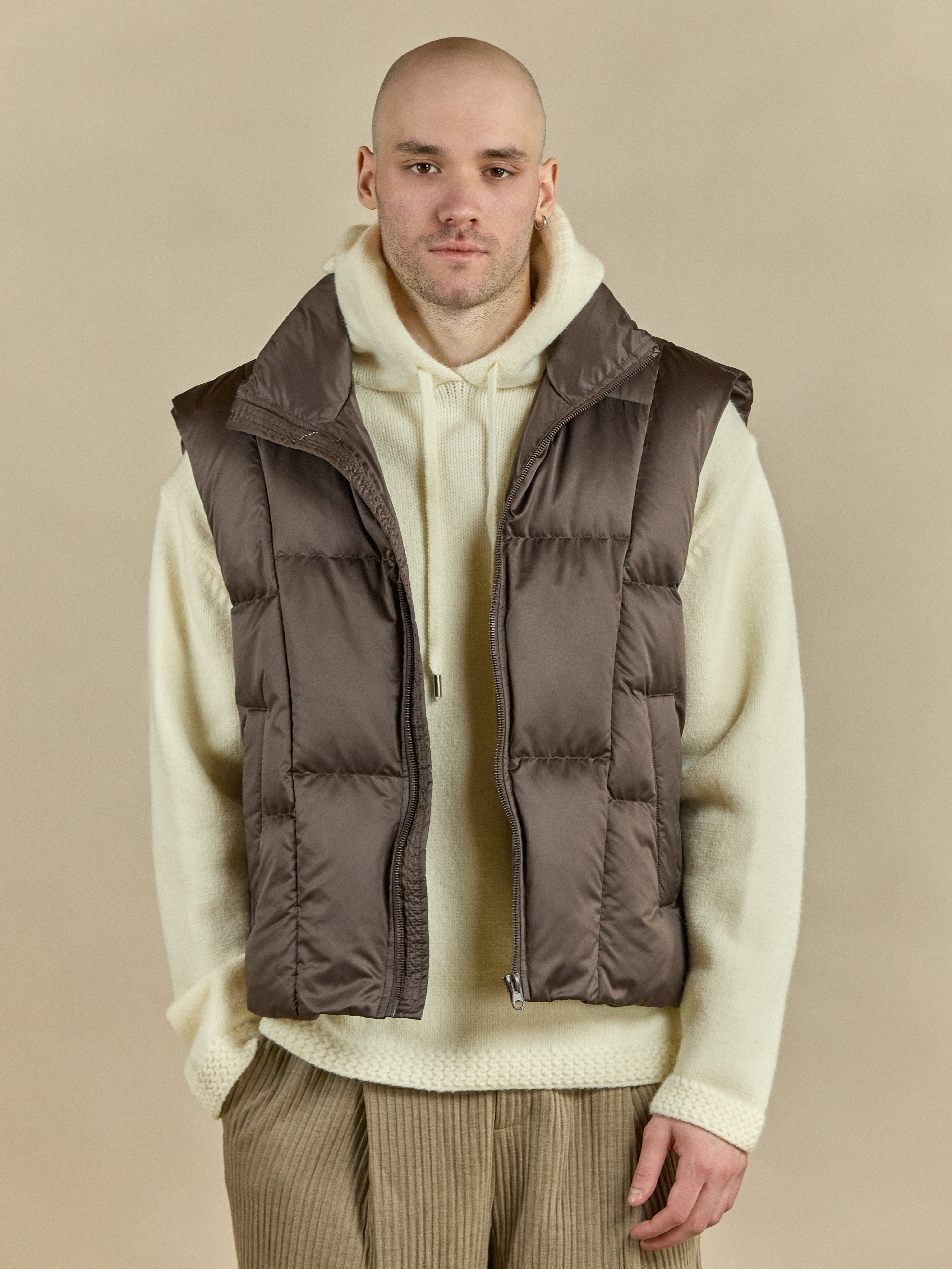 Стеганый жилет с эффектом глянца. Ворот стойка Два прорезных кармана и один внутренний, застежка на молнии.