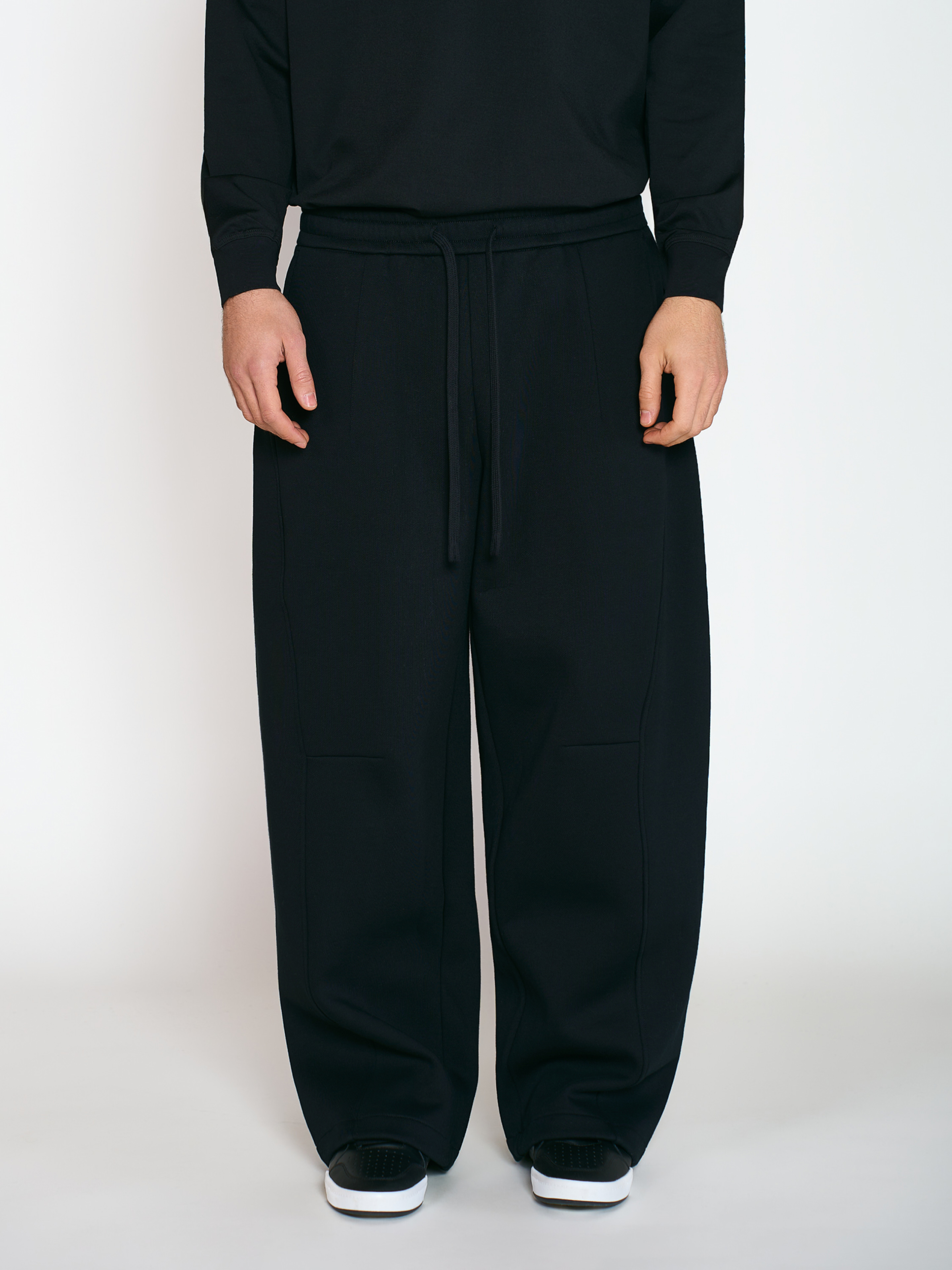 Брюки Trek свободного кроя, прямого силуэта, с выточками по всему изделию. Модель выполнена из плотного 100% хлопкового футера. Пояс на резинке, также на нижней части брюк есть регулируемые кулиски. Два боковых прорезных кармана. Параметры модели Рост: 188 см Грудь – 105 см, талия - 70 см, бедра - 93 см Размер на модели: L