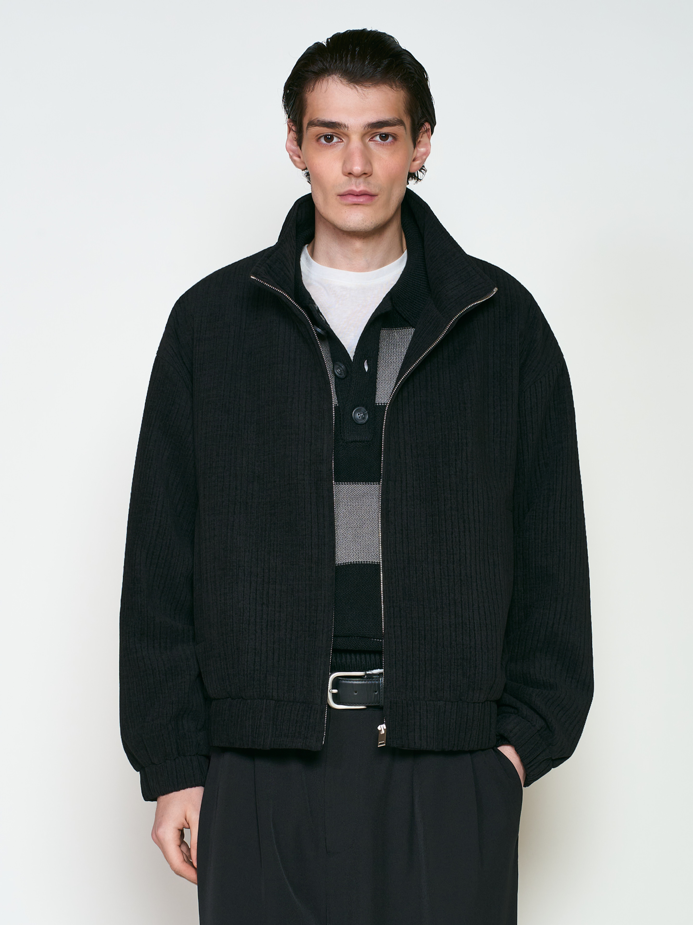 Куртка с воротом стойка, свободного кроя. Модель выполнена из вельвета с добавлением хлопкового бархата. Застегивается на скрытую молнию, два боковых прорезных кармана. Манжеты на рукавах и нижней части куртки сделаны на резинке для плотного прилегания к телу. Параметры модели Рост: 188 см Грудь – 105 см, талия - 70 см, бедра - 93 см Размер на модели: L