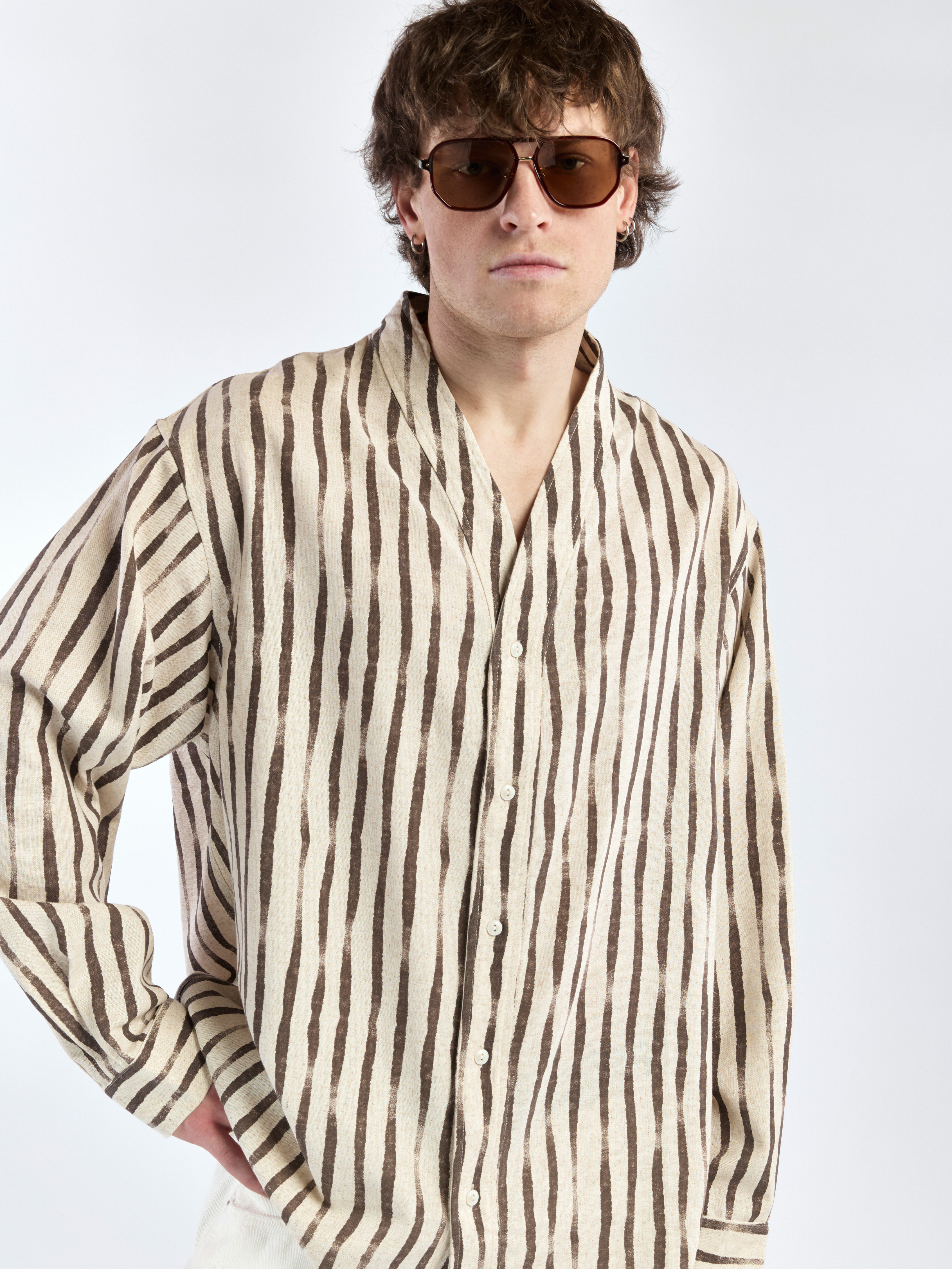 Рубашка свободного кроя с V-образным вырезом. Модель выполнена из смесовой ткани средней плотности в небрежную полоску. Застегивается на пуговицы. Параметры модели Рост: 187 см Грудь – 101 см, талия - 76 см, бедра - 92 см Размер на модели: L