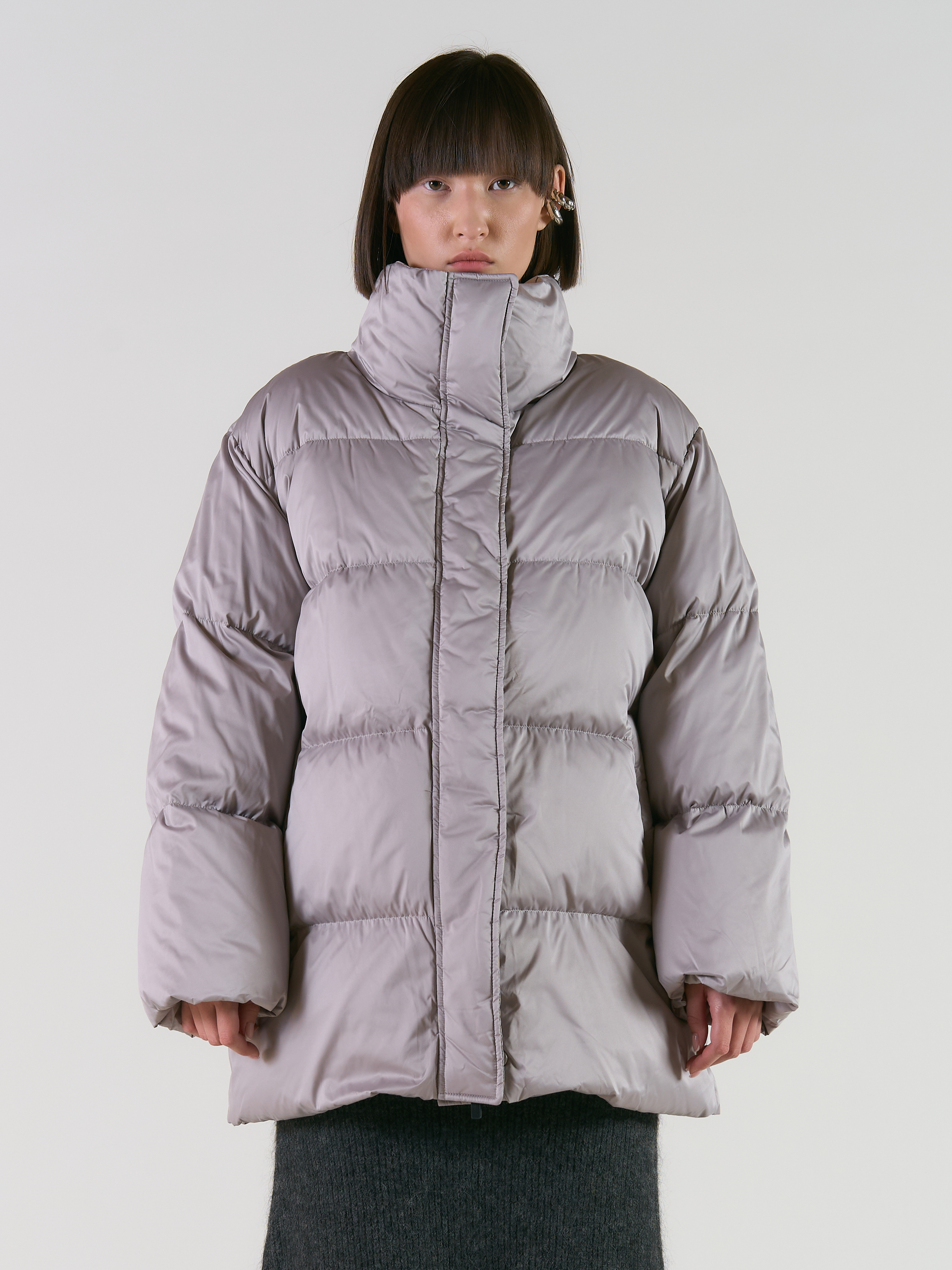 Короткая женская стеганая куртка свободного кроя с легким натуральным утеплителем. Застежка на молнию и планку с кнопками по всей длине. Длинные рукава и спущенная линия плеча. Два прорезных боковых кармана без застежки. Прямой нижний край без разрезов и утяжек