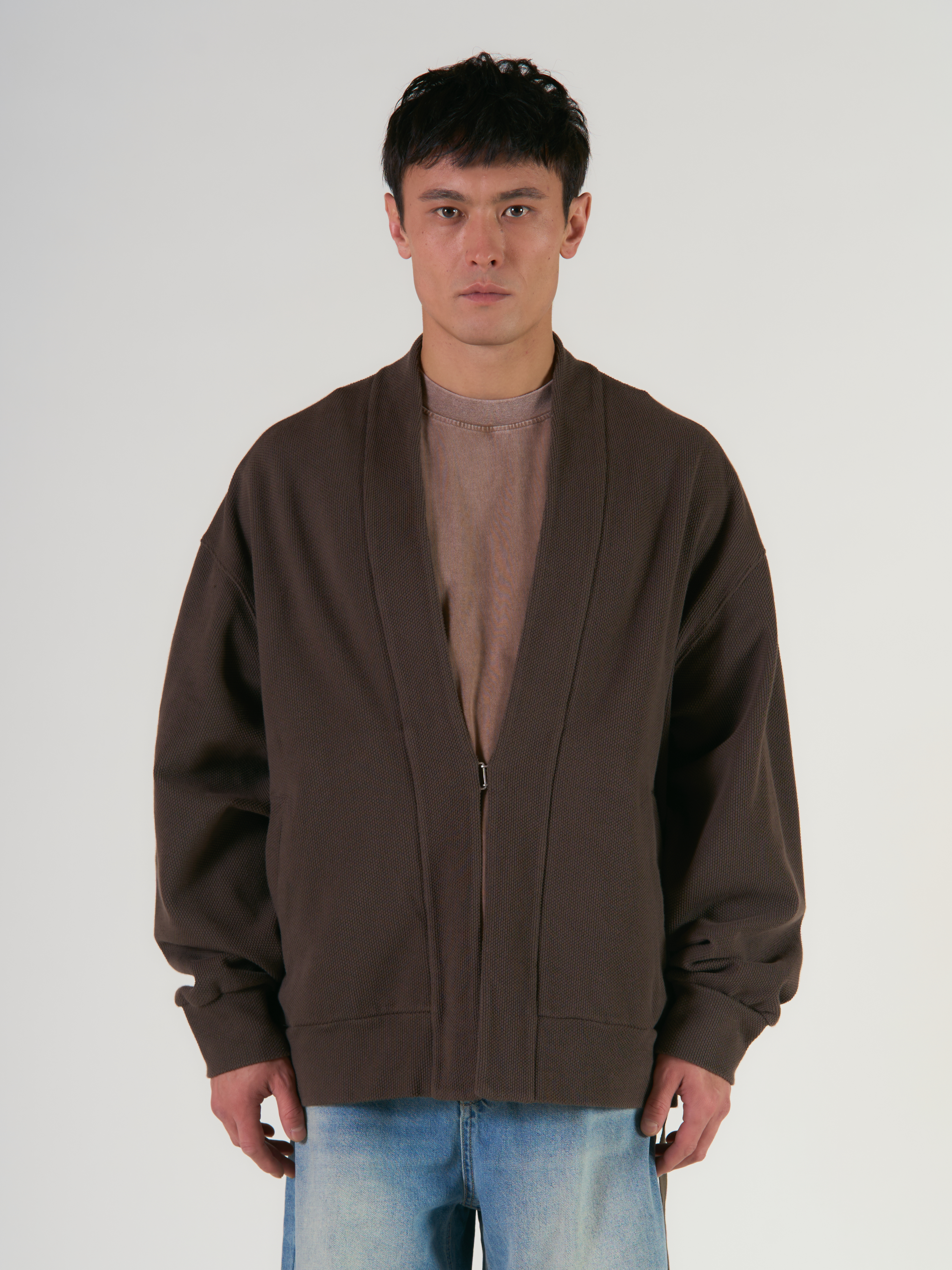 Кардиган - кимоно свободного кроя с металлической застежкой. Выполненная из смесовой ткани. Глубокий V-образный вырез на груди. Длинные свободные рукава с манжетами в рубчик, спущенная линия плеча.