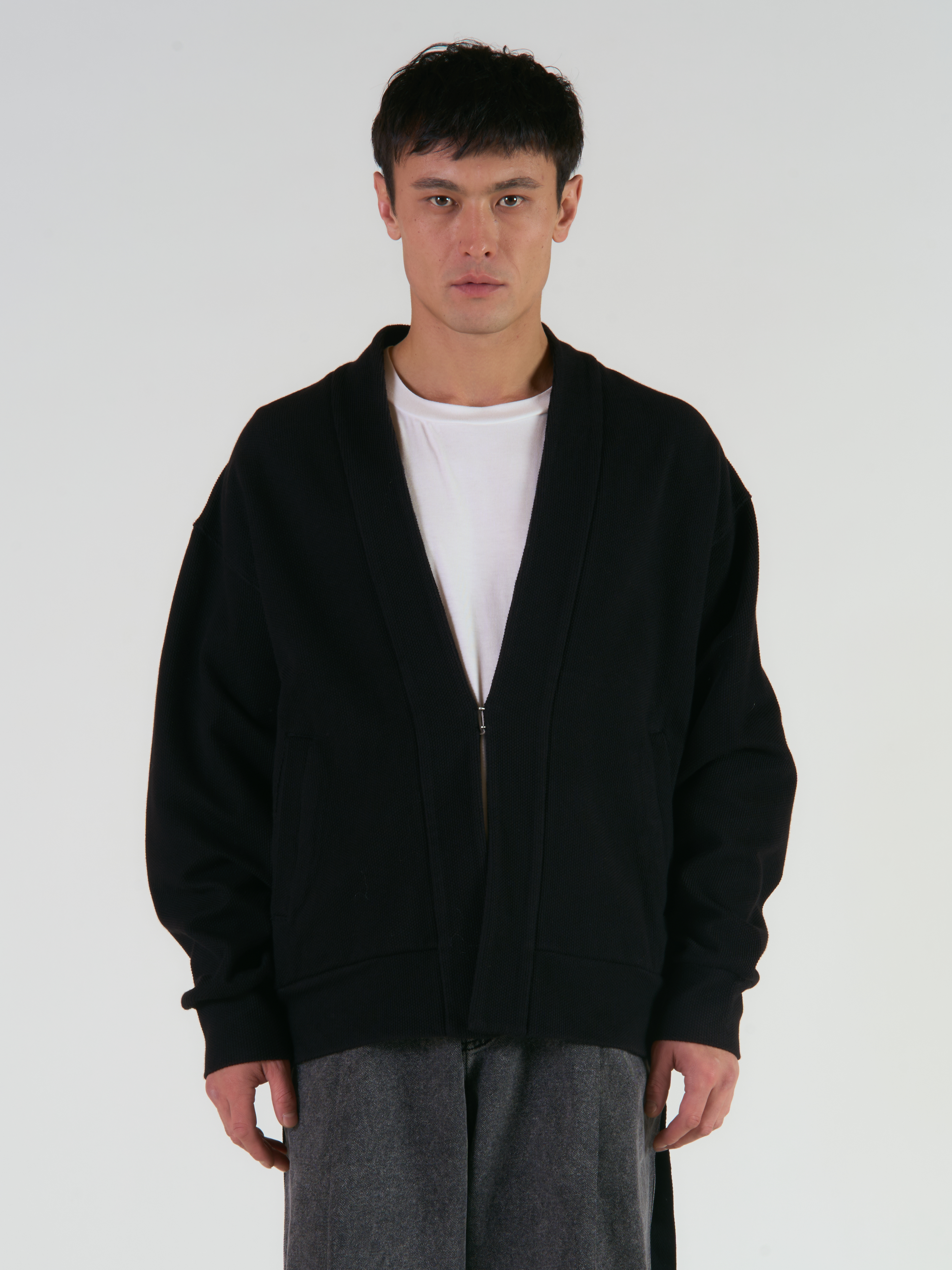 Кардиган - кимоно свободного кроя с металлической застежкой. Выполненная из смесовой ткани. Глубокий V-образный вырез на груди. Длинные свободные рукава с манжетами в рубчик, спущенная линия плеча.