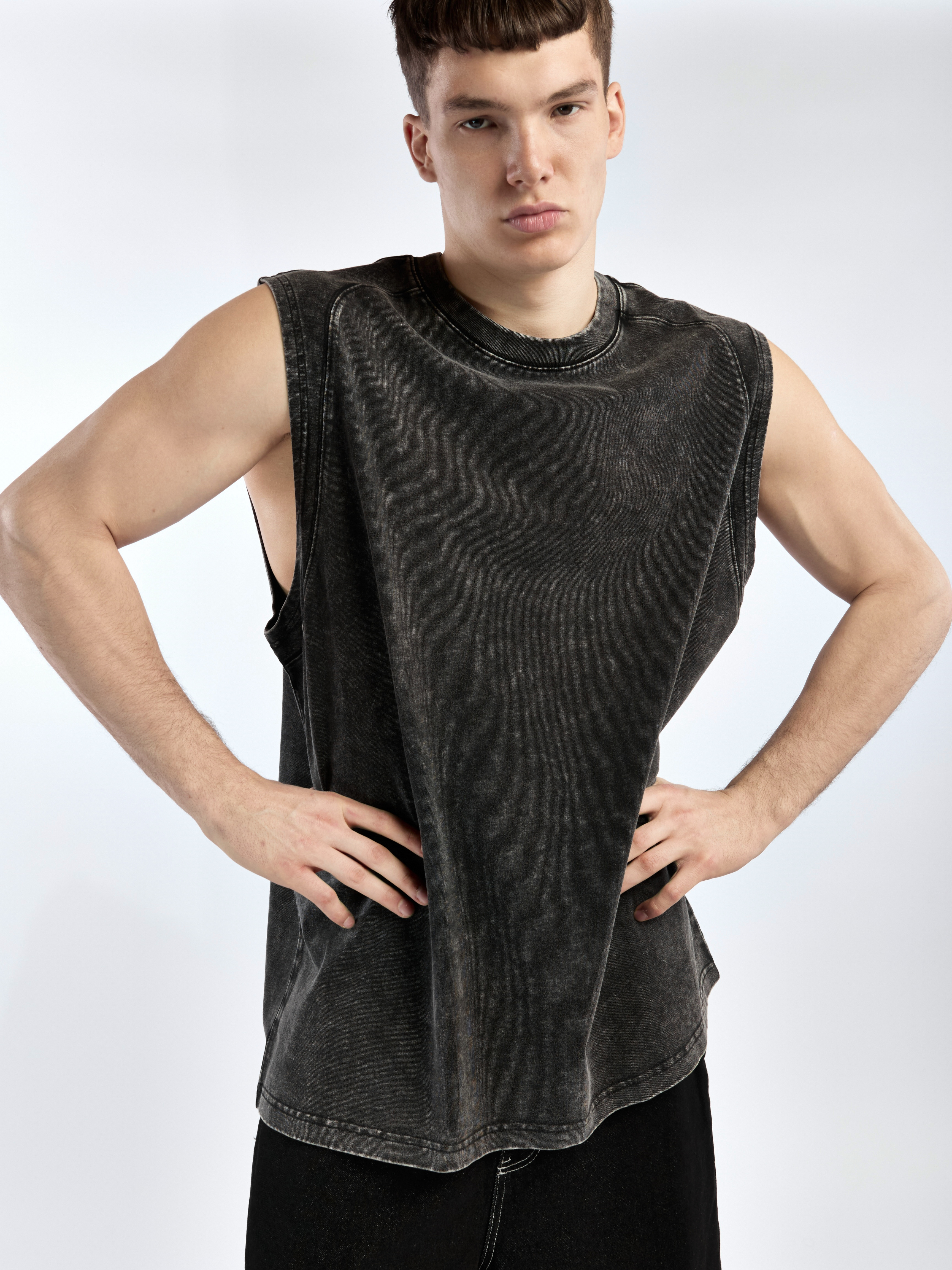 Майка широкого кроя с акцентными швами. Модель выполнена из вареного хлопка с эффектом времени. Параметры модели Рост: 189 см Грудь – 103 см, талия - 79 см, бедра - 97 см Размер на модели: ХL
