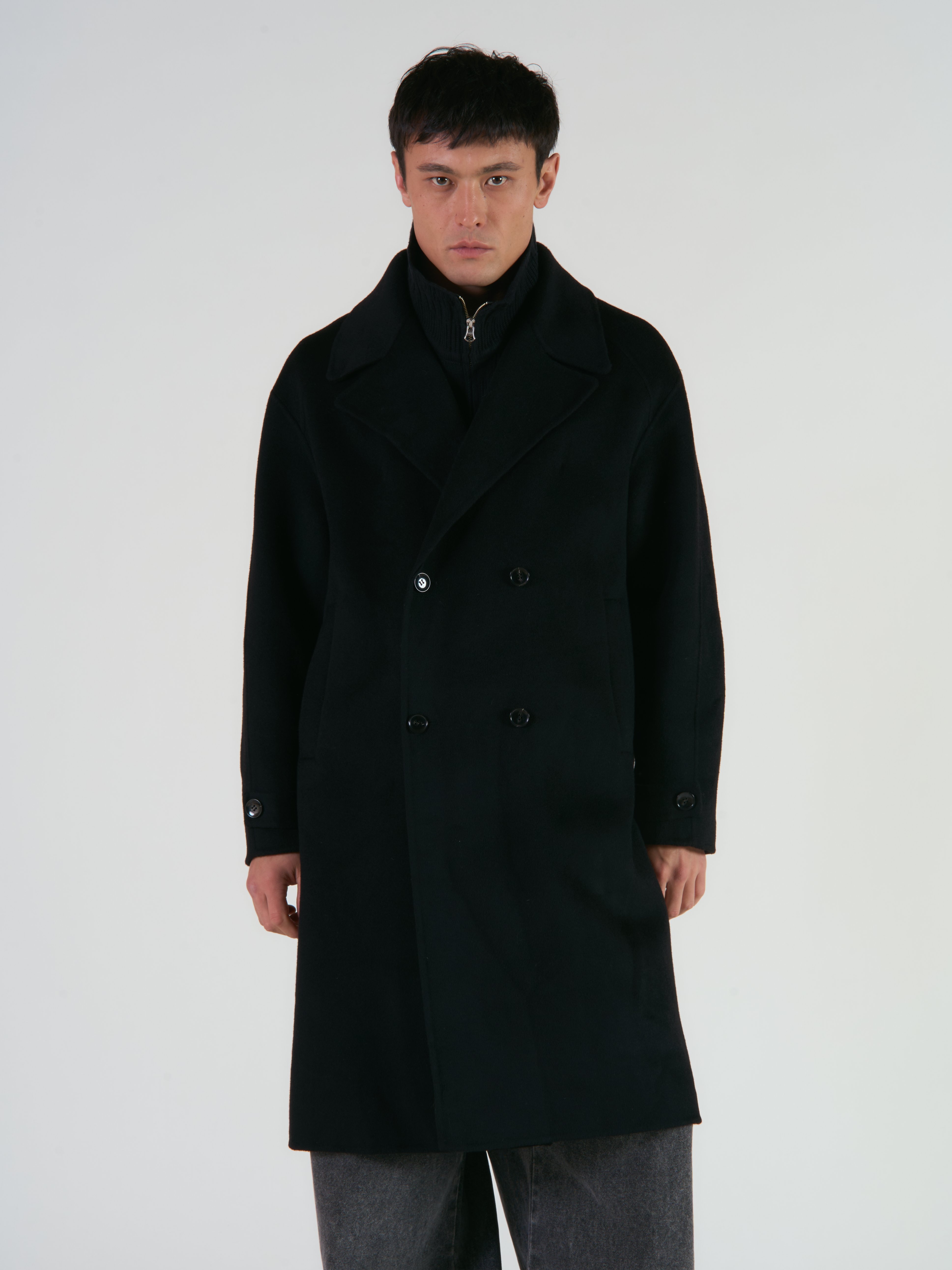 Двубортное пальто классического кроя из натуральной шерсти со съемной манишкой и поясом. Воротник с разрезными лацканами, длинные рукава и передние прорезные карманы. Застегивается на пуговицы.