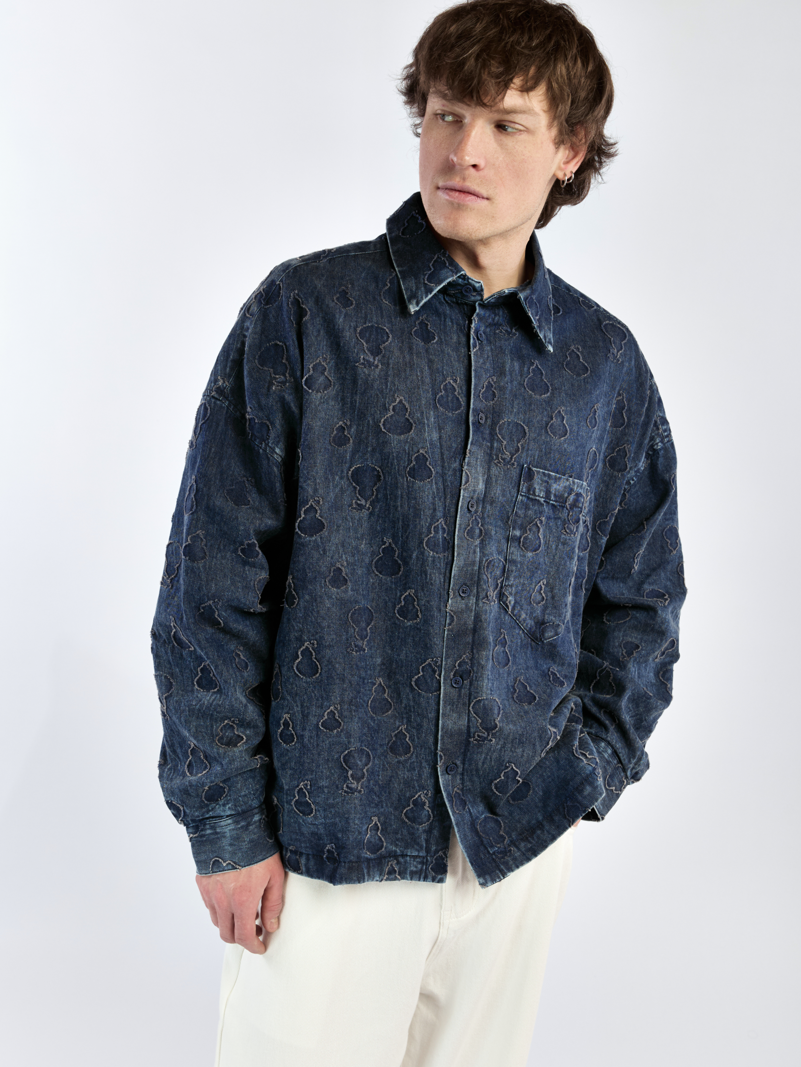 Куртка-рубашка свободного кроя с отложным воротником. Модель выполнена из мягкой джинсовой ткани с фактурной вышивкой по всему изделию. Два боковых прорезных кармана и один накладной на передней части. Застегивается на пуговицы. Параметры модели Рост: 187 см Грудь – 101 см, талия - 76 см, бедра - 92 см Размер на модели: L
