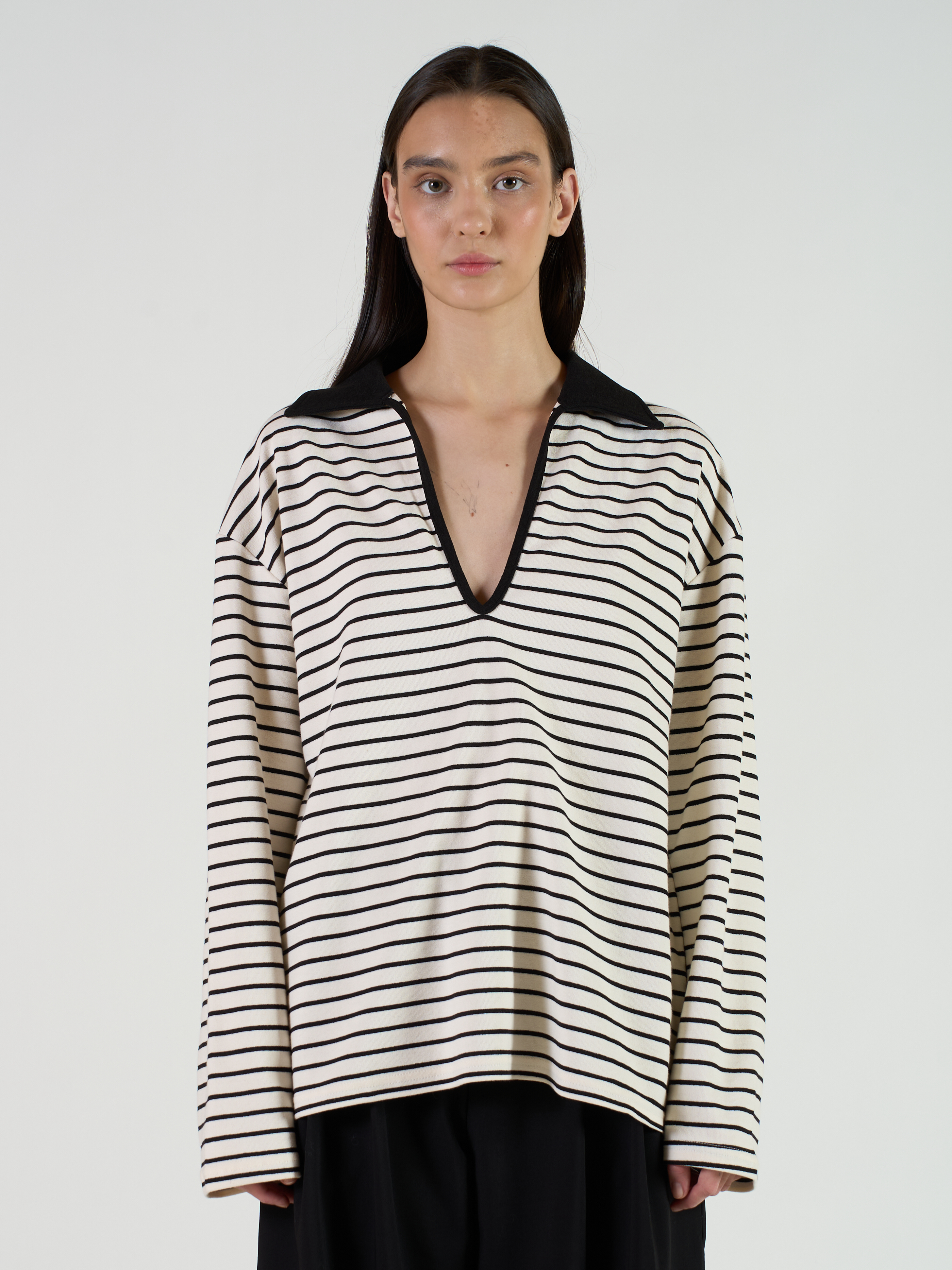 Поло с длинным рукавом Sailor с глубоким V-образным вырезом и контрастным воротником. Изделие выполнено из трикотажной ткани средней плотности. Параметры модели Рост: 173 см Грудь - 80 см, талия - 62 см, бедра - 90 см Размер на модели: ONE SIZE
