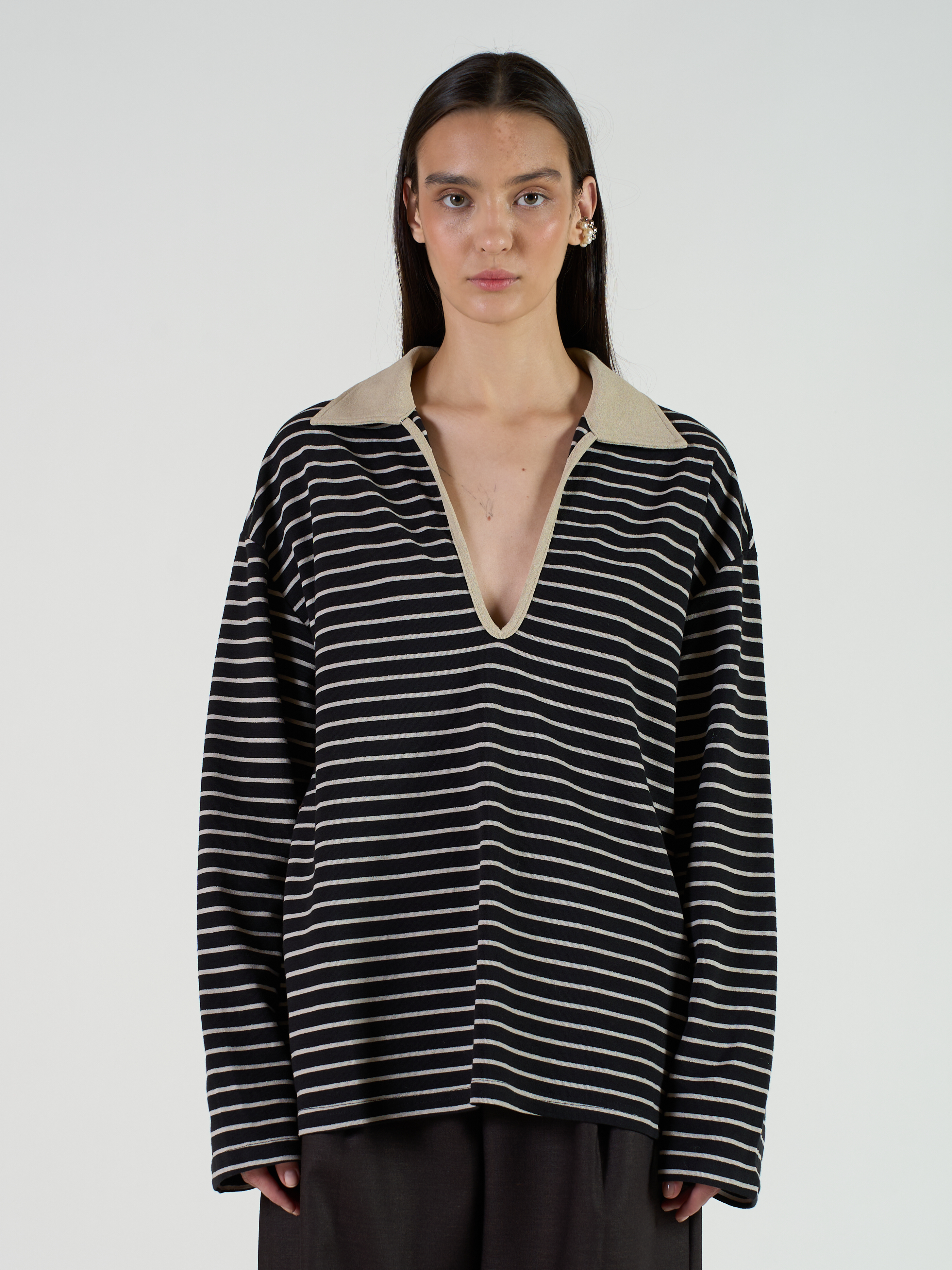Поло с длинным рукавом Sailor с глубоким V-образным вырезом и контрастным воротником. Изделие выполнено из трикотажной ткани средней плотности. Параметры модели Рост: 173 см Грудь - 80 см, талия - 62 см, бедра - 90 см Размер на модели: ONE SIZE