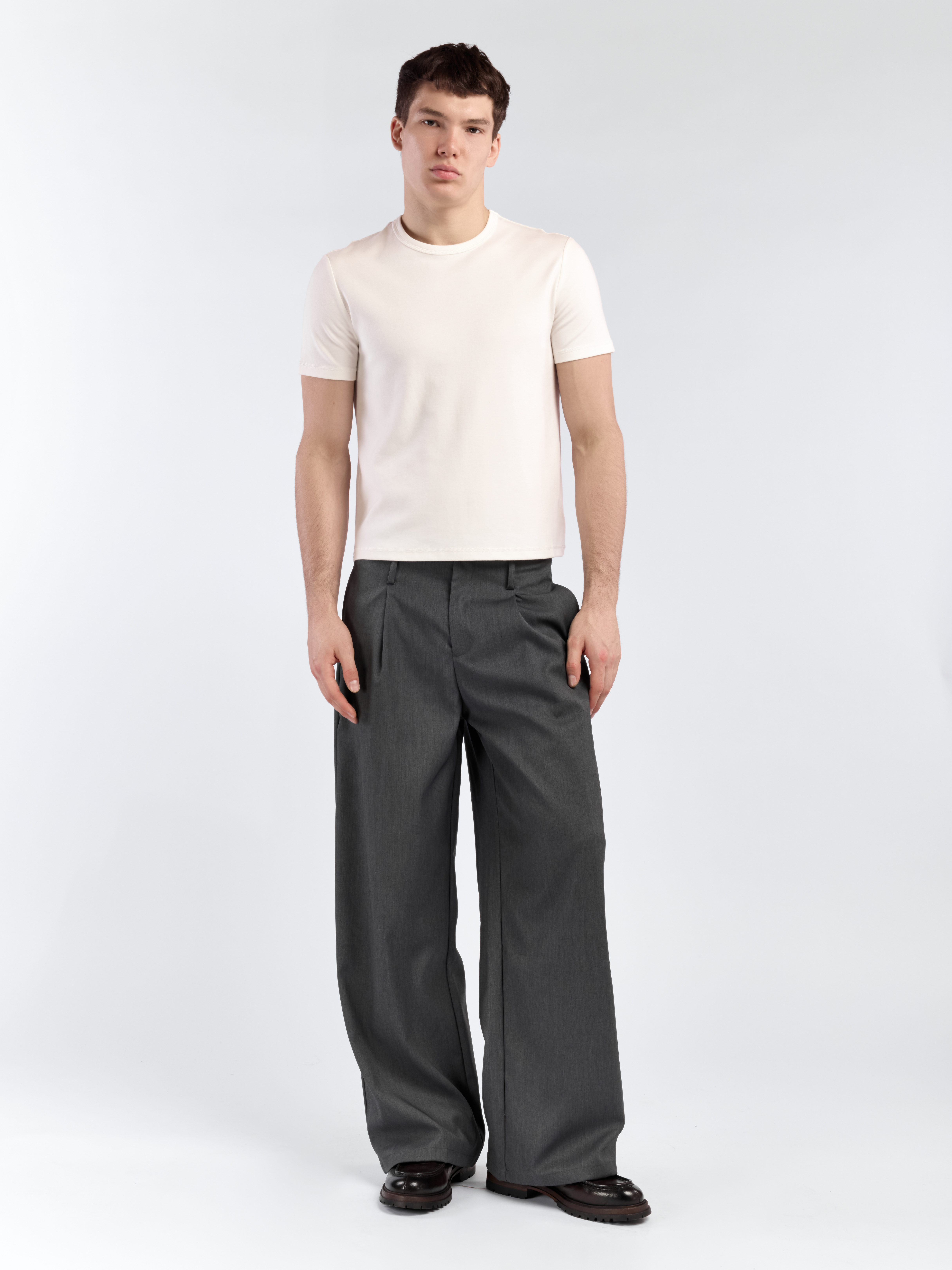 Брюки свободного кроя и прямого силуэта. Минималистичный дизайн и утонченность — это идеальное сочетание, которое мы старались отразить в нашем изделии. Главная особенность брюк — это построение лекала, где пояс интегрирован в основу. А безупречная посадка получилась благодаря выточкам. Модель выполнена из смесовой костюмной ткани. Два боковых прорезных кармана и два задних. Шлевки для ремня чуть приспущены от линии пояса. Для создания полноценного костюма можно приобрести двубортный пиджак с акцентными плечами и лацканами. Параметры модели Рост: 189 см Грудь – 99 см, талия - 82 см, бедра - 105 см Размер на модели: L