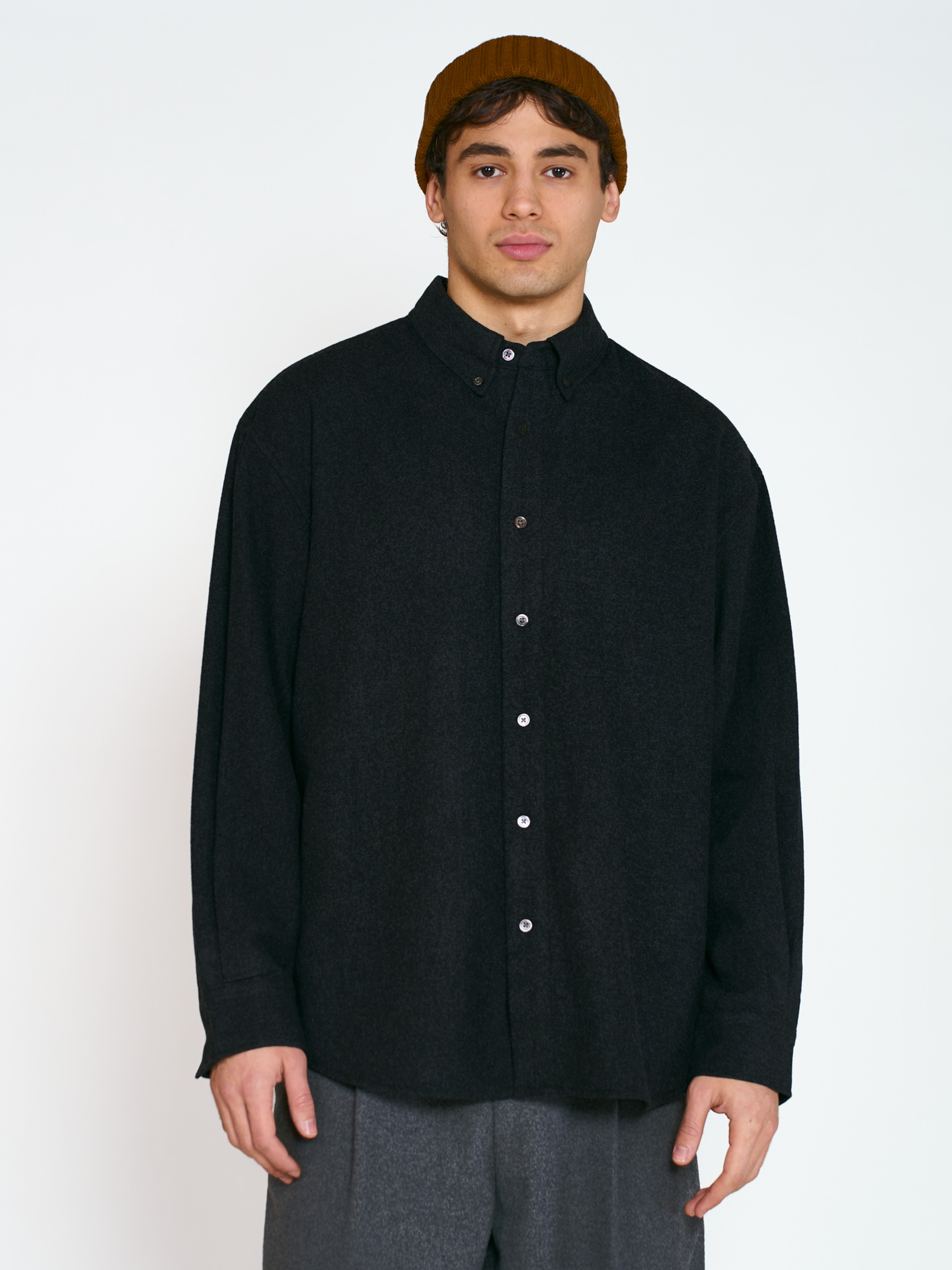 Рубашка Shiro свободного кроя, со спущенной линией плеча. Модель выполнена из шерстяной костюмной ткани, с подкладом из хлопка. Параметры модели Рост: 188 см Грудь – 105 см, талия - 70 см, бедра - 93 см Размер на модели: L