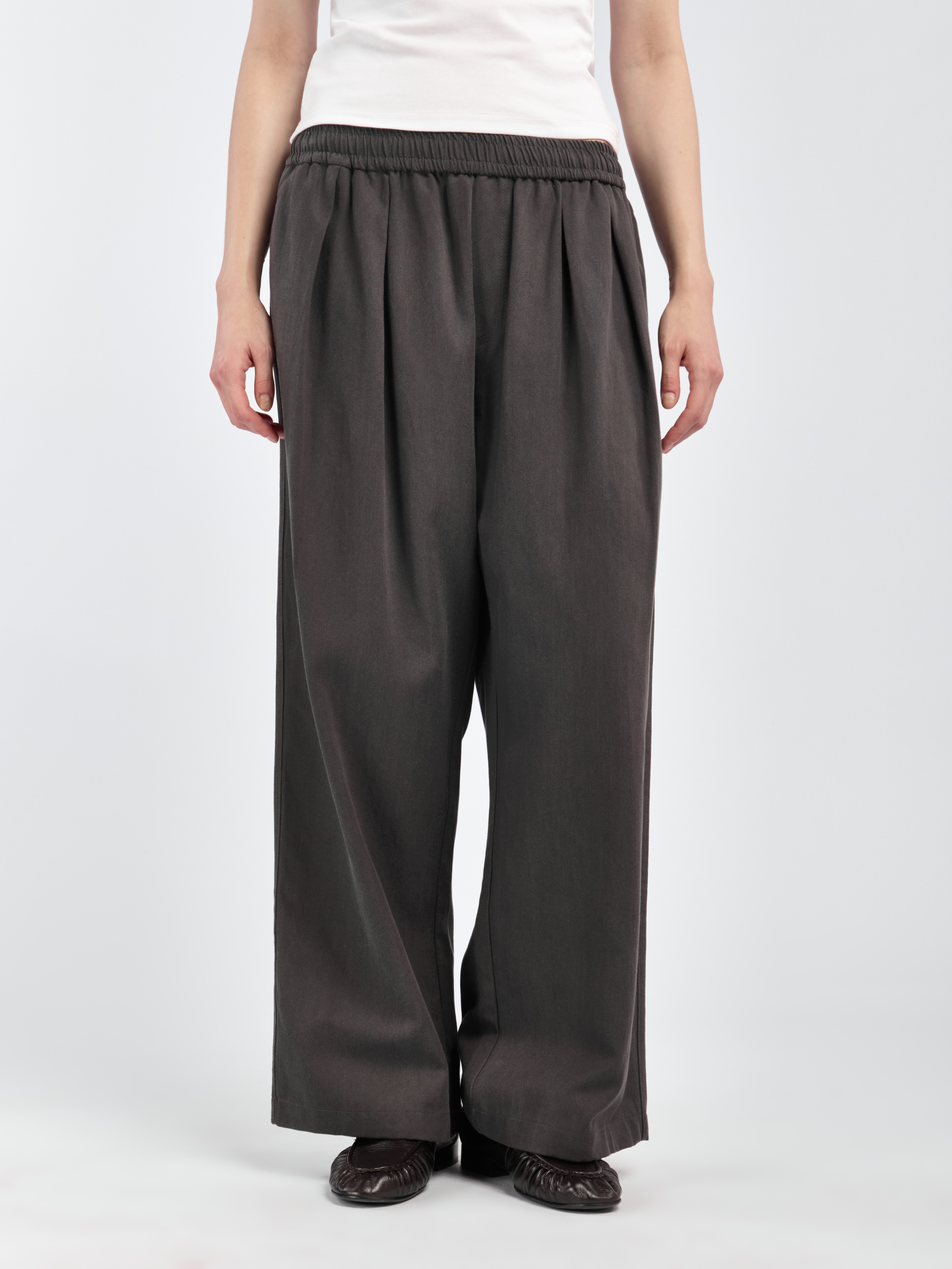 Брюки прямого кроя, свободного силуэта. Модель выполнена из смесовой ткани. Пояс полностью выполнен на резинке с внутренними кулисками. Два боковых прорезных кармана.