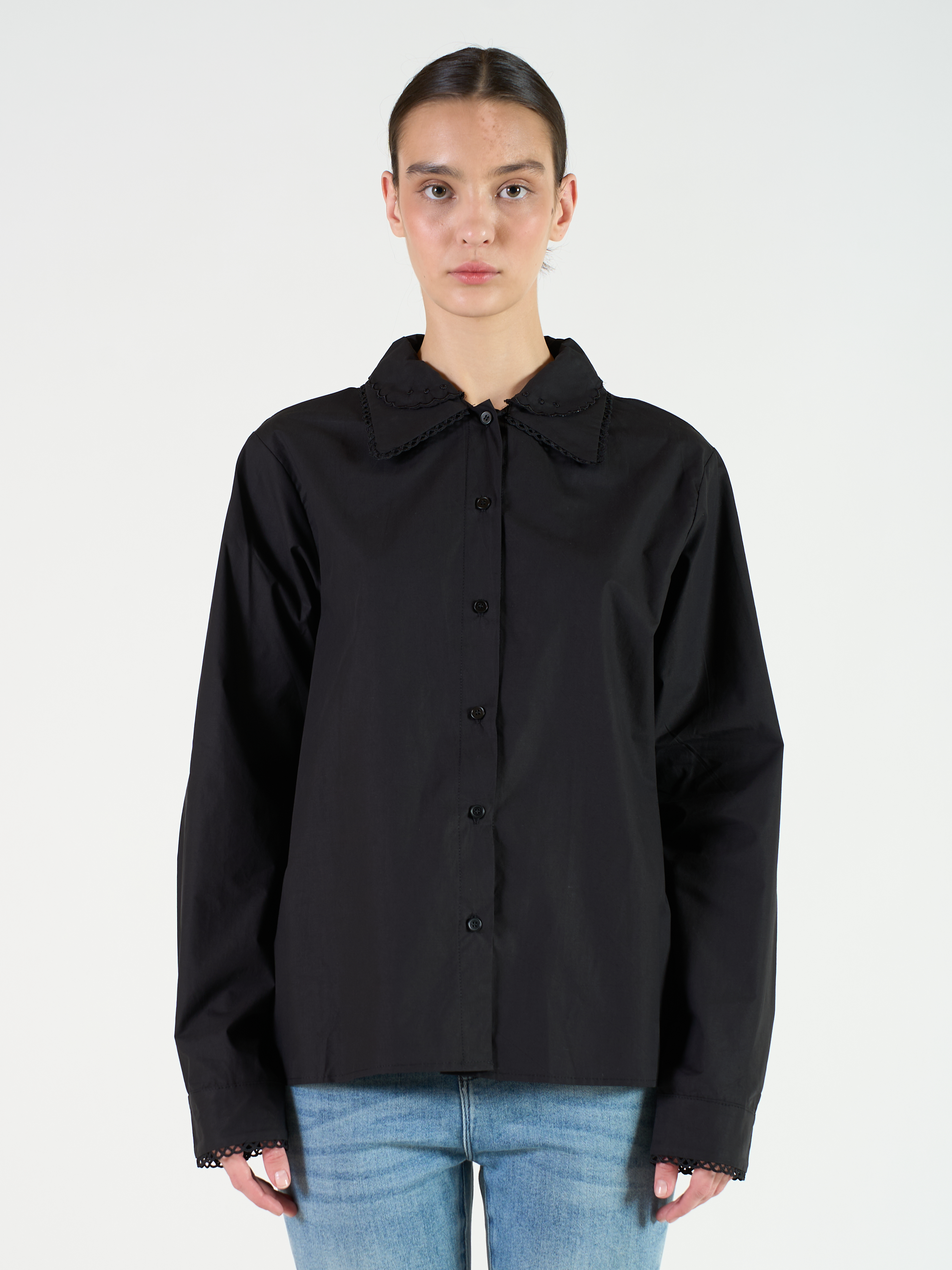 Рубашка Lace свободного кроя, О-силуэта. В данной модели мы применили принцип многослойности, ворот сшит из двух разных воротников и обработан кружевом. Создается эффект наложения. Манжеты рукавов также оформлены кружевом в тон основной ткани. Изделие выполнено из нежной и облегченной хлопковой ткани.