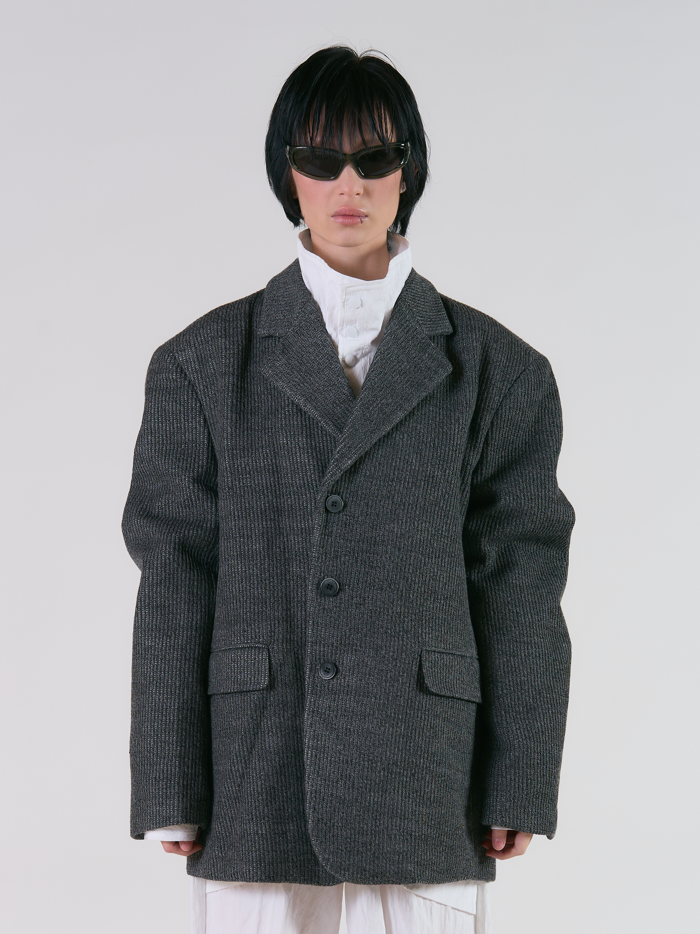 Однобортный пиджак свободного кроя из смесовой ткани. Широкий отложной воротник, застежка на три пуговицы спереди, два боковых прорезных кармана с клапанами. Длинные рукава с прямыми манжетами на пуговицах и подплечниками. Параметры модели: Рост: 183 см Грудь - 105 см, талия - 88 см, бедра - 98 см Размер на модели: L