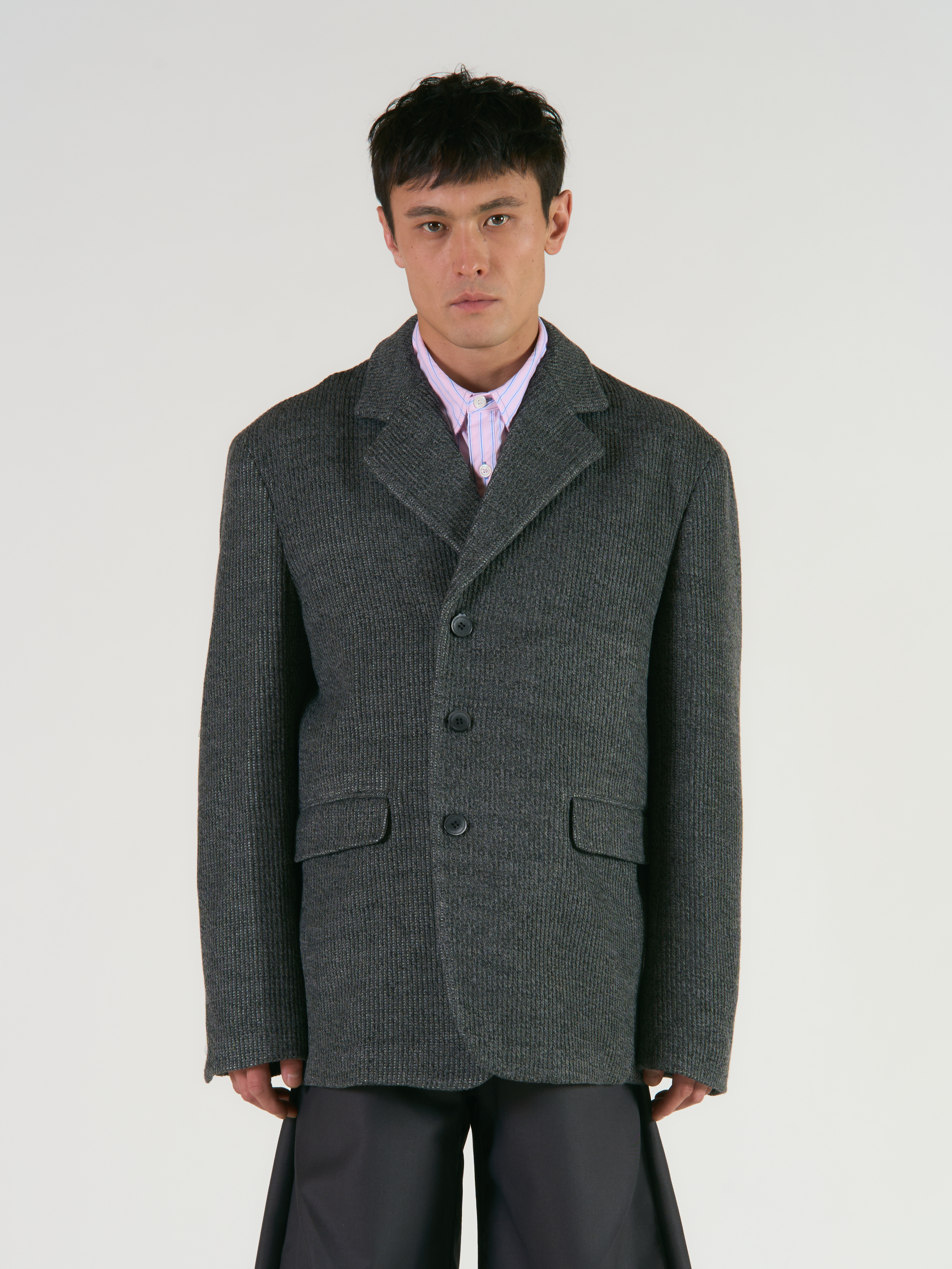 Однобортный пиджак свободного кроя из смесовой ткани. Широкий отложной воротник, застежка на три пуговицы спереди, два боковых прорезных кармана с клапанами. Длинные рукава с прямыми манжетами на пуговицах и подплечниками. Параметры модели: Рост: 183 см Грудь - 105 с м, талия - 88 см, бедра - 98 см Размер на модели: L