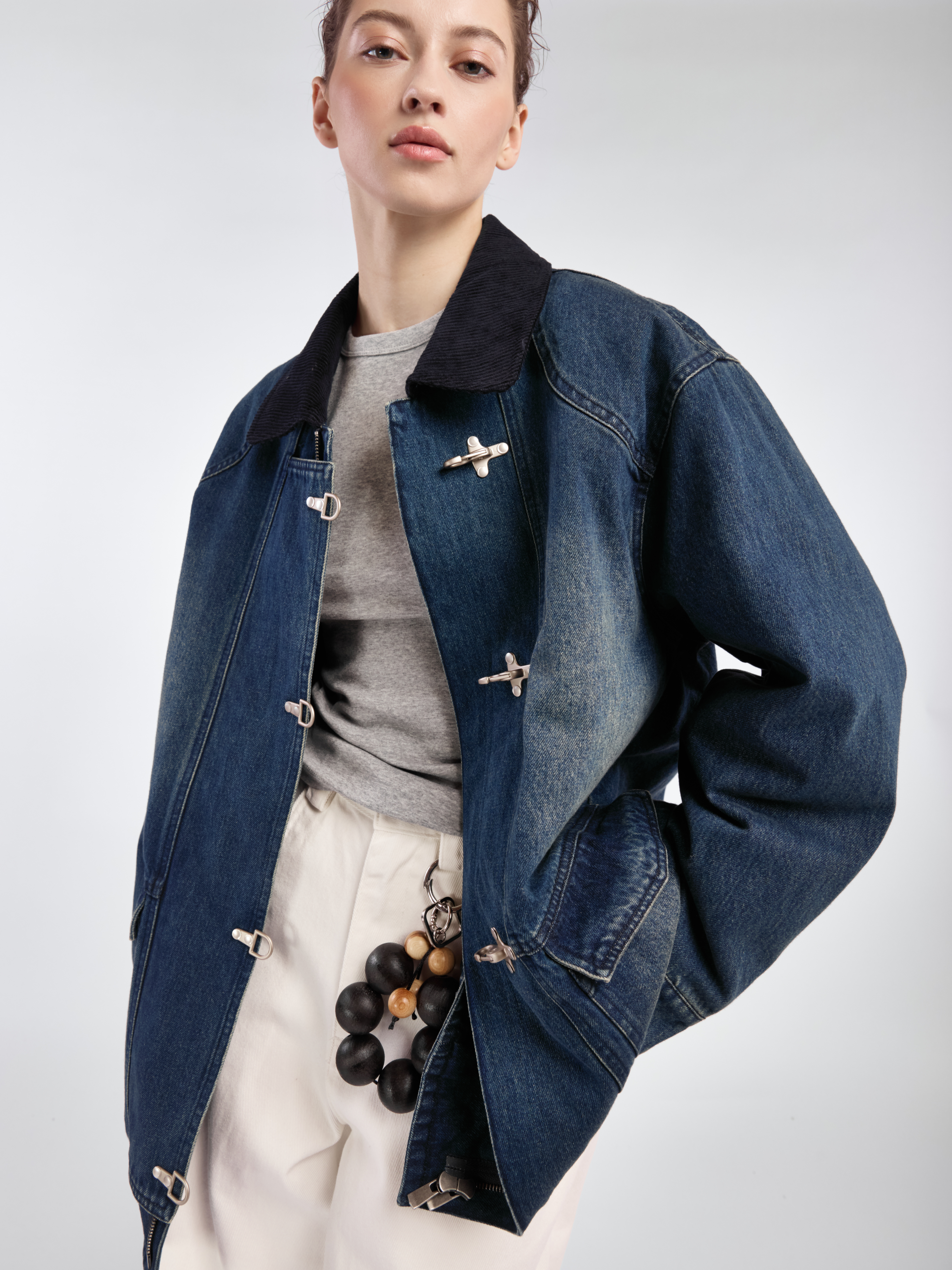 Утепленная куртка в азиатском стиле широкого кроя, с вельветовым воротником. Модель выполнена из вываренного денима с потертостями. Стеганый подклад. Застегивается на металлические застежки и молнию с ветрозащитной планкой. Два передних накладных кармана. Параметры модели Рост: 171 см Грудь - 80 см, талия - 59 см, бедра - 87 см Размер на модели: ONE SIZE