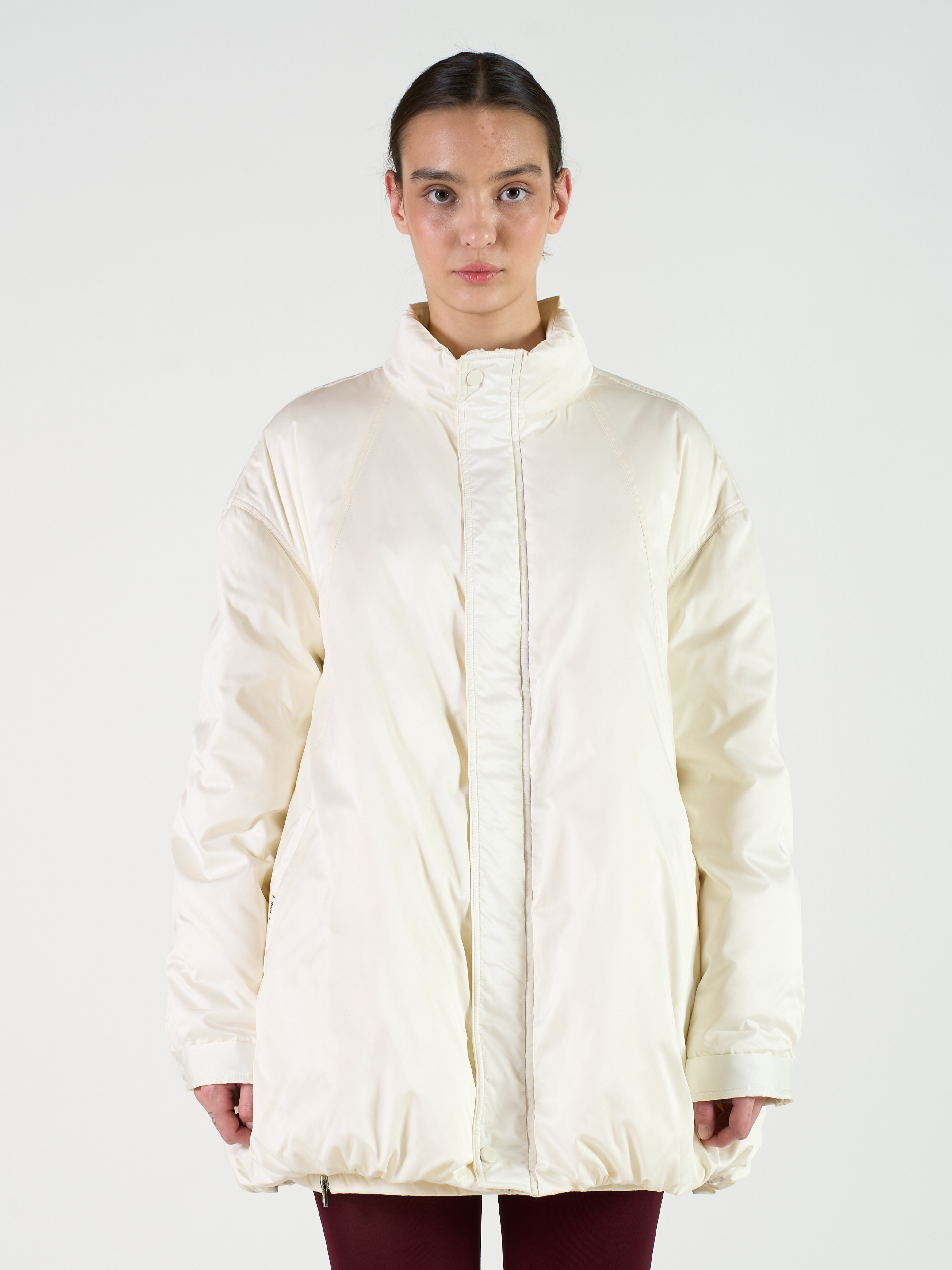 Утепленный пуховик-трапеция из натурального наполнителя. Воротник-стойка, длинные прямые рукава со спущенной линией плеча и манжетами на кнопках. Застежка на молнию и планку с кнопками