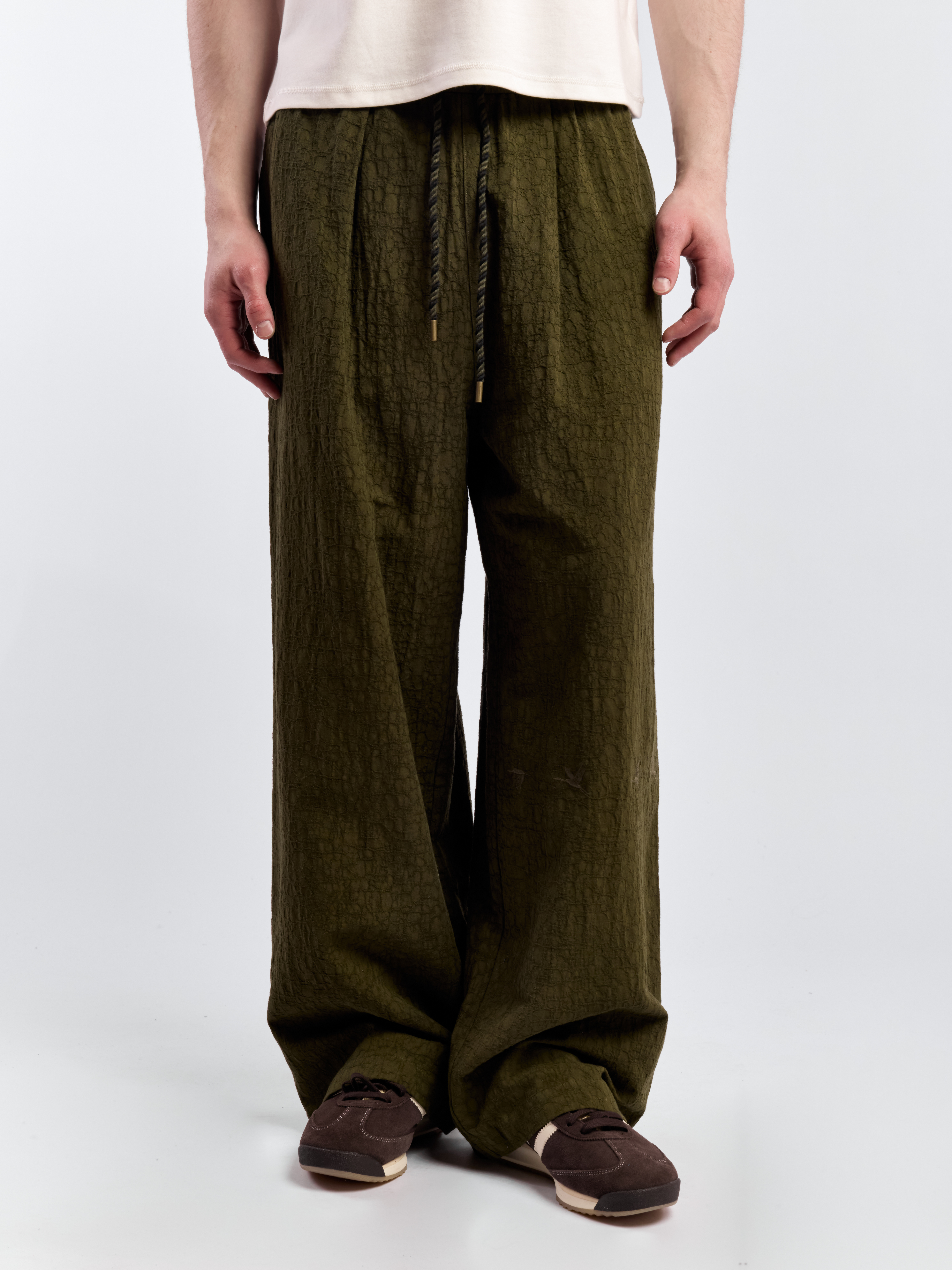 Брюки с вышивкой журавлей на брючине, широкого кроя и прямого силуэта. Модель выполнена из жатого хлопка с характерной фактурой. Пояс на резинке с акцентными кулисками. Два боковых прорезных кармана и два задних. Параметры модели Рост: 186 см Грудь – 100 см, талия - 73 см, бедра - 94 см Размер на модели: L