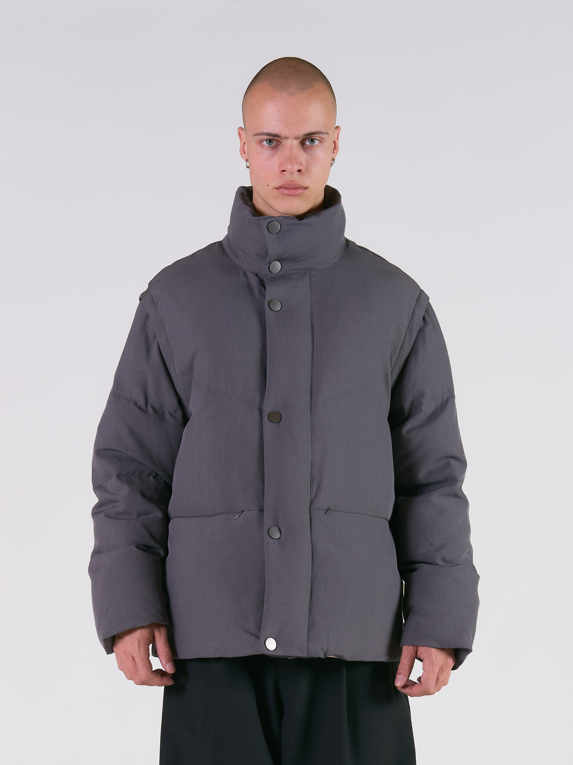 Куртка-трансформер из мягкого материала. Благодаря съемным рукавам на молнии можно носить как жилетку. За стегивается на молнию и металлические кнопки. Два прорезных кармана на молнии спереди и один внутренний.