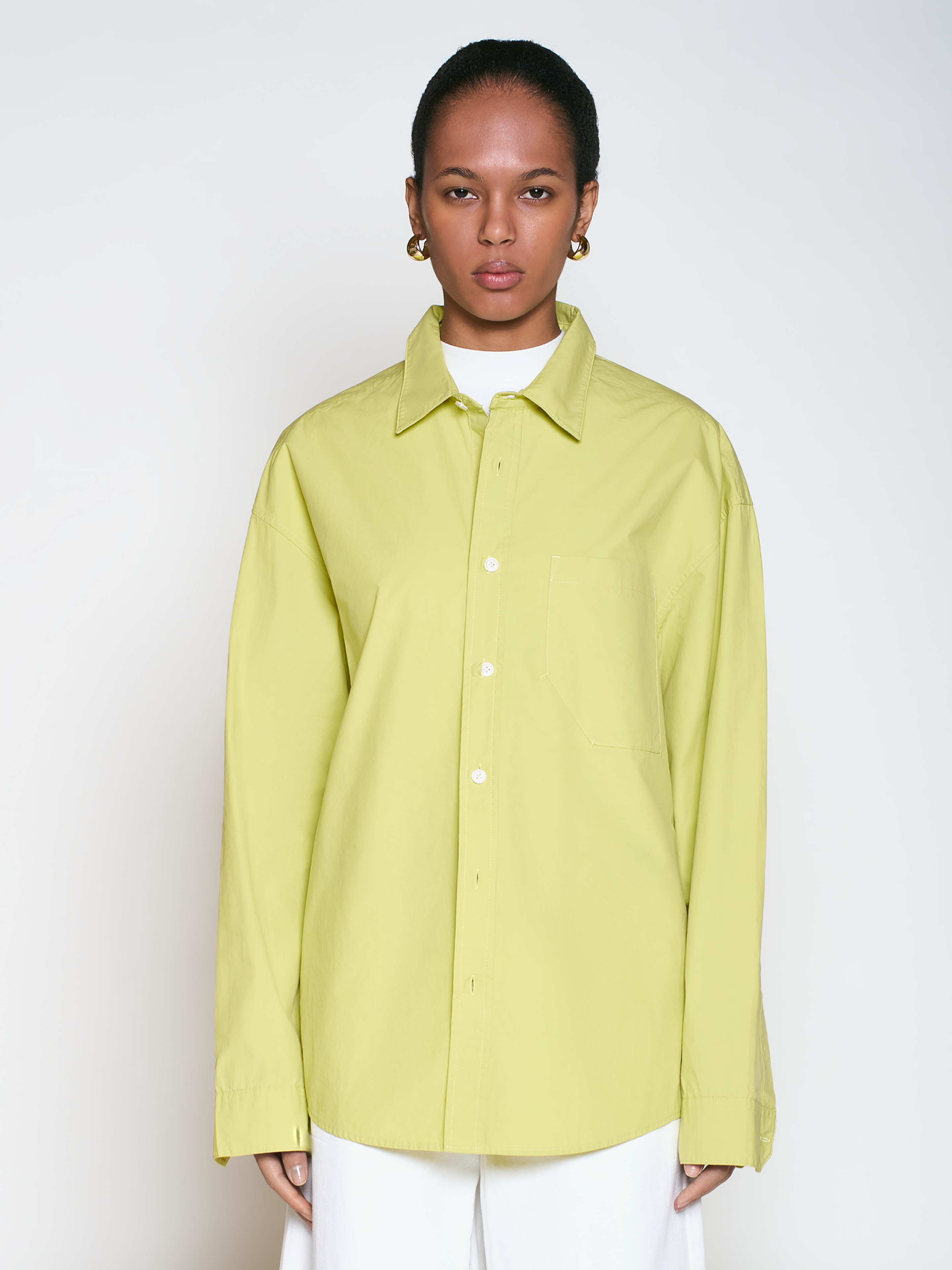 Оверсайз-рубашка О-силуэта, с приспущенной линией плеча и одним нагрудным карманом. Изделие выполнено из плотной хлопковой ткани с небольшим глянцевым эффектом. Хорошая базовая модель для новых ярких идей.