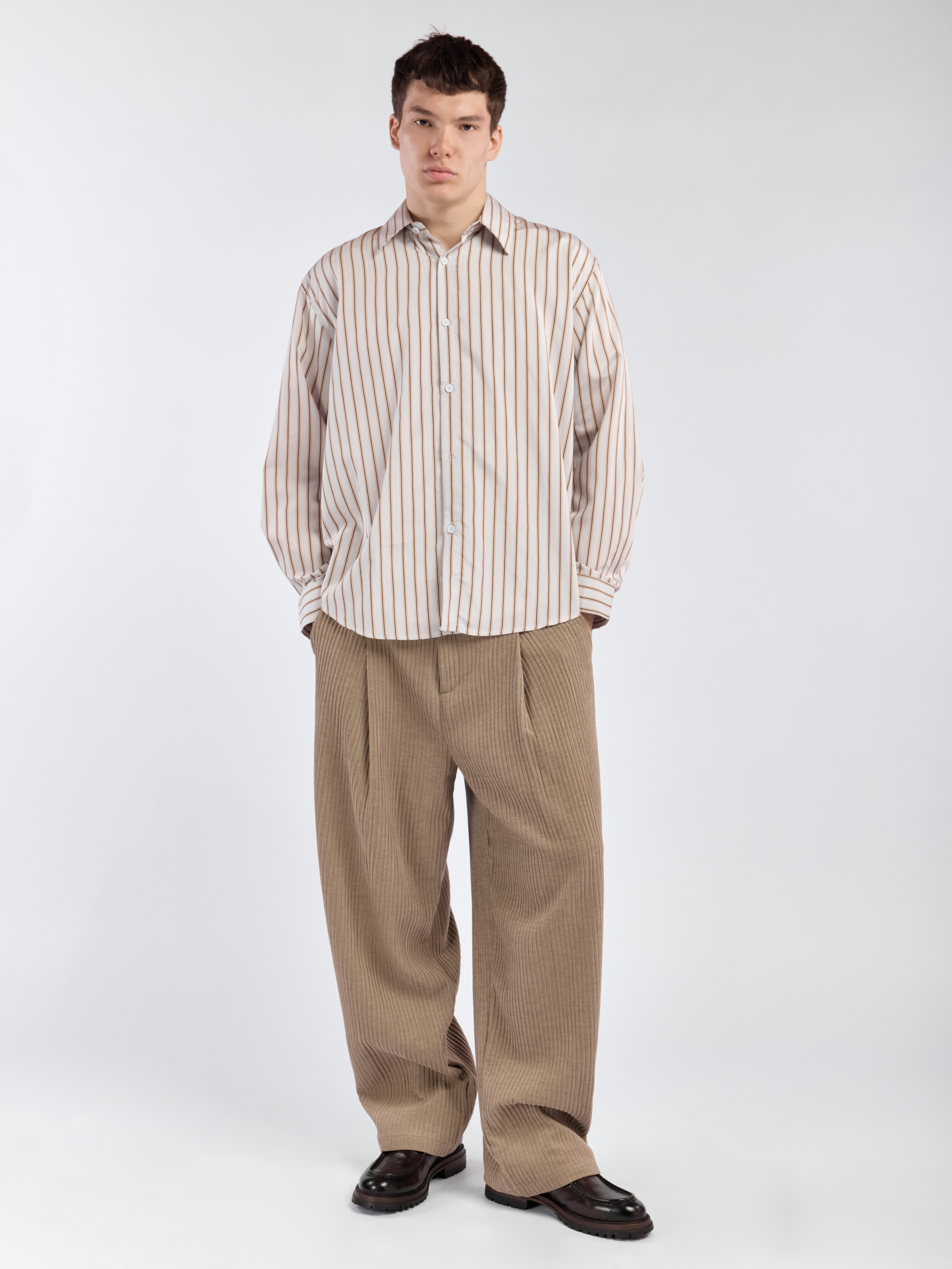Костюмные брюки прямого кроя с защипами. Модель выполнена из вельвета средней плотности. Классический пояс со шлевками для ремня. Два боковых прорезных кармана и два задних. Отдельно можно приобрести вельветовую куртку с воротником-стойкой. Параметры модели Рост: 189 см Грудь – 93 см, талия - 70 см, бедра - 88 см Размер на модели: ХL
