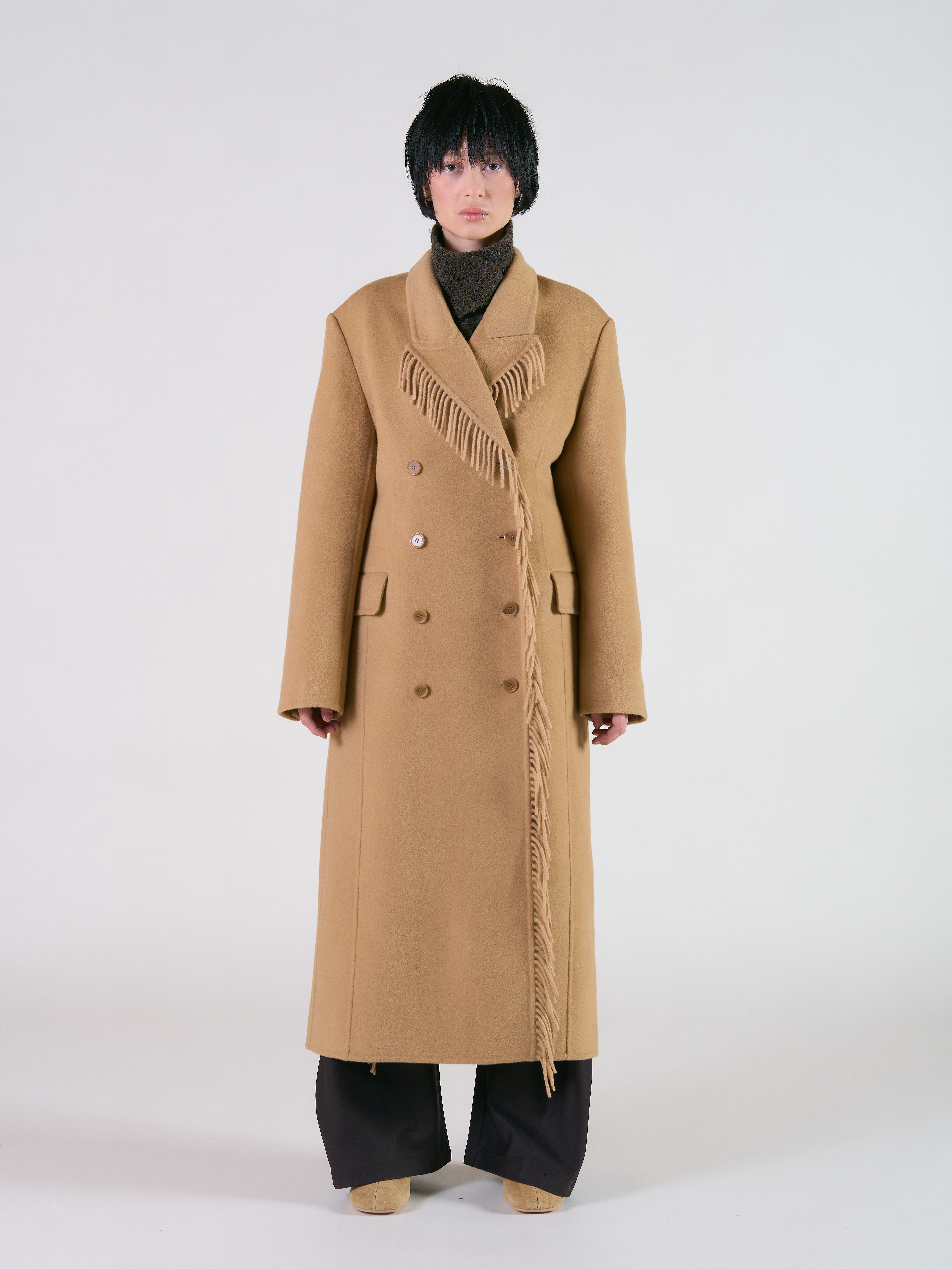 Приталенное двубортное пальто классического кроя. Застегивается на пуговицы. Декоративные элементы в виде бахромы и швов. Два прорезных кармана и шлица.