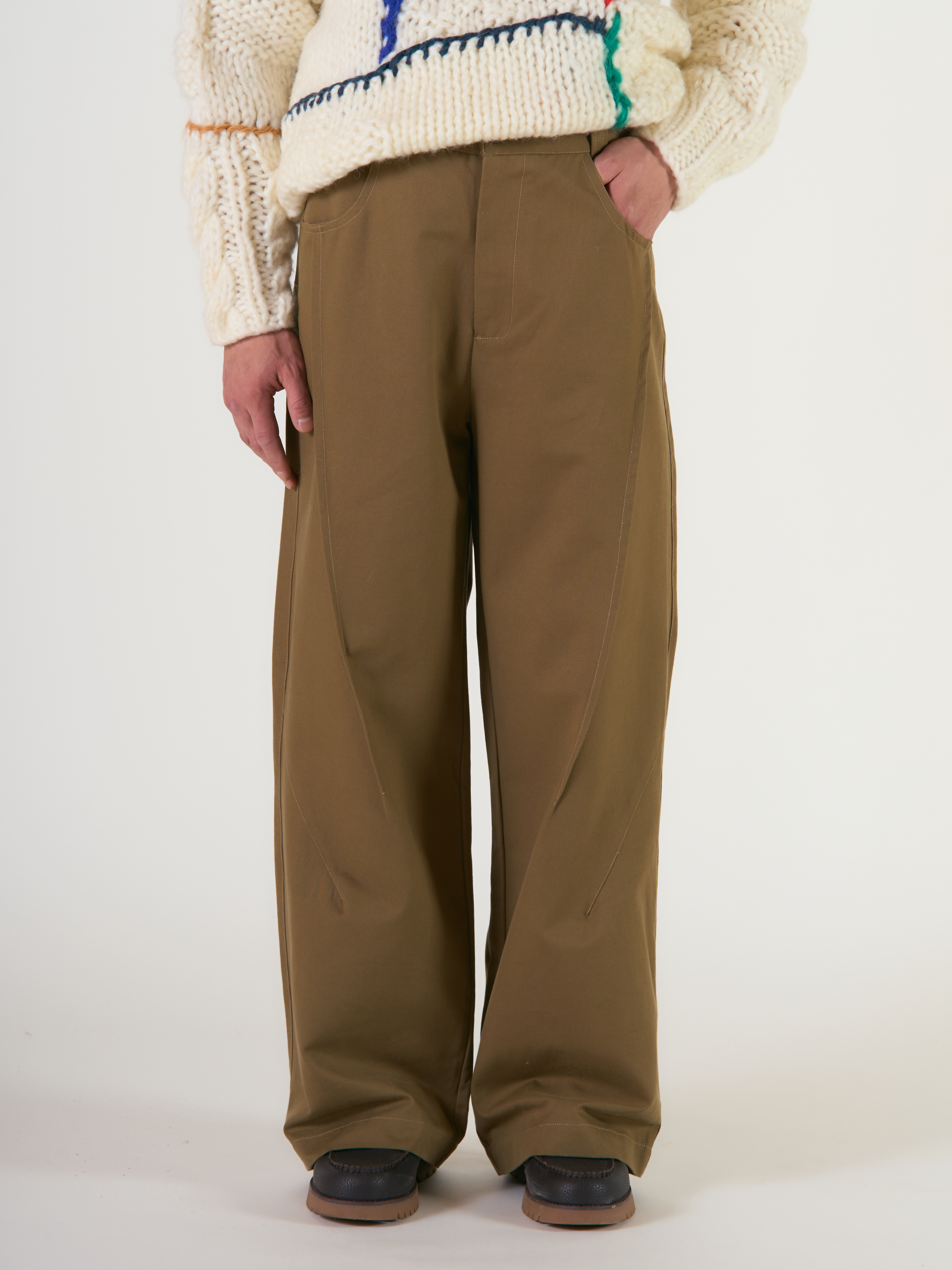 Широкие Брюки Uniform свободного кроя. Выполнены из плотного хлопка, благодаря чему хорошо держат свою форму. На передней части расположены два кармана и акцентные строчки, также имеют два задних кармана с клапанами. Застежка на пуговице и молнии. Параметры модели: Рост: 183 см Грудь - 105 см, талия - 88 см, бедра - 98 см Размер на модели: L